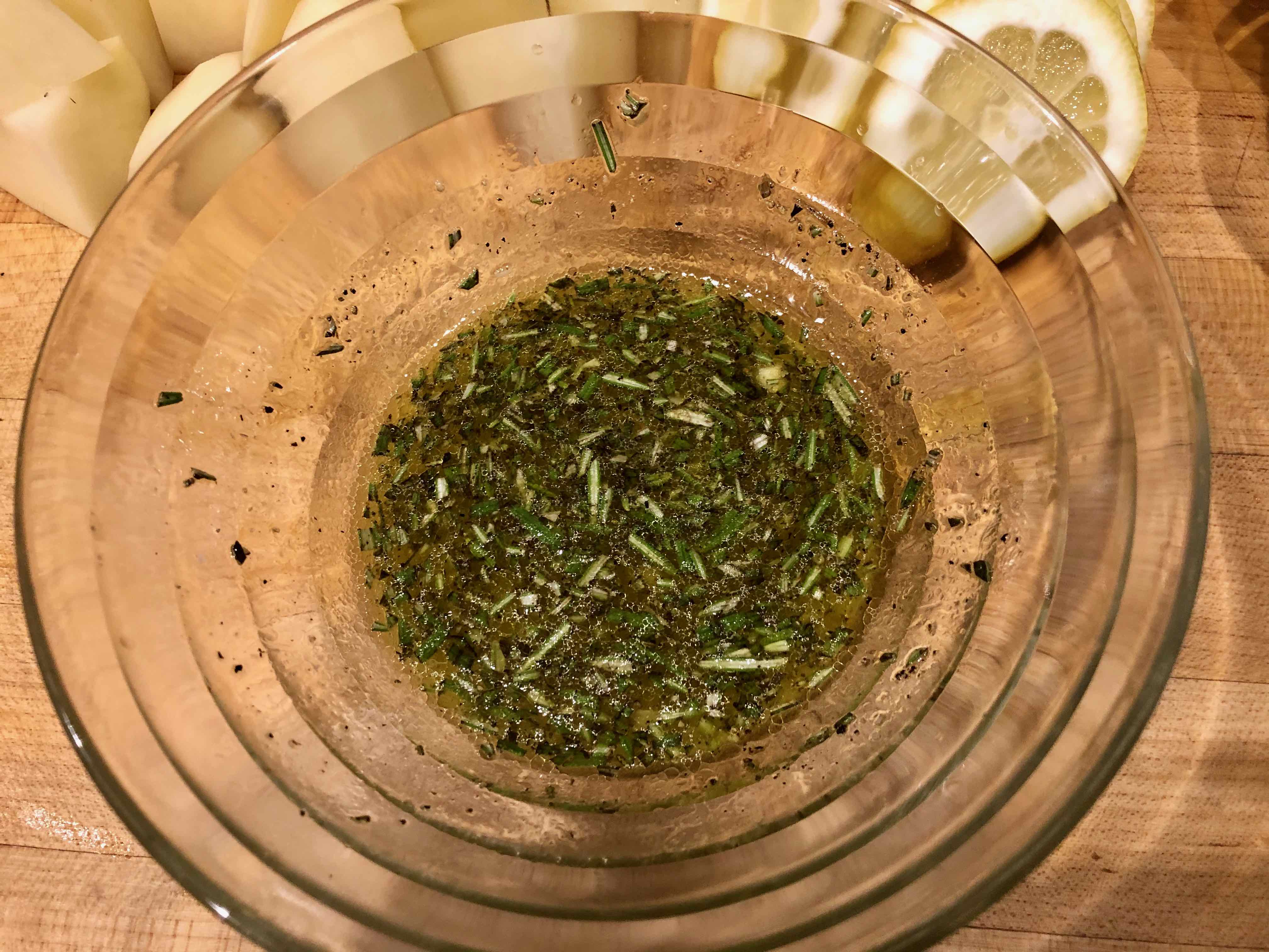 3. To the bowl, add the oil, rosemary, garlic, and some salt and pepper. (Reserve most of your seasoning for the chicken thighs.)