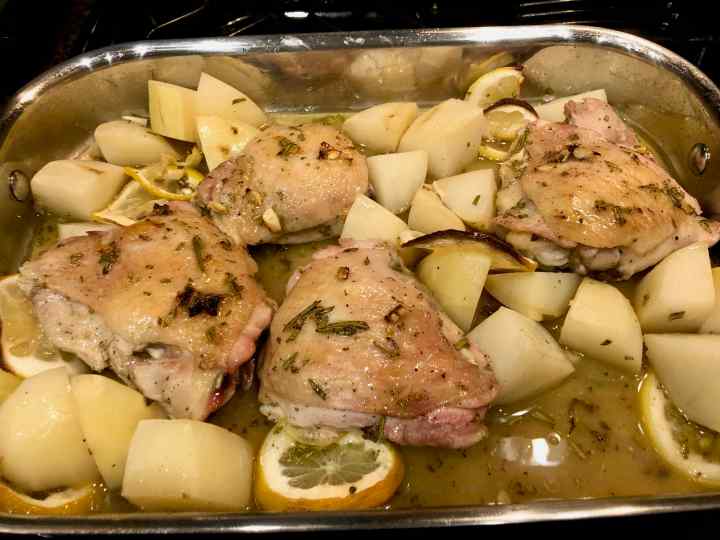 6. Tuck the potatoes and lemon slices between the thighs. (Don’t over crowd the pan; if you have too many potatoes, as I did, roast them drizzled with some olive oil along with chopped rosemary, salt and pepper.)