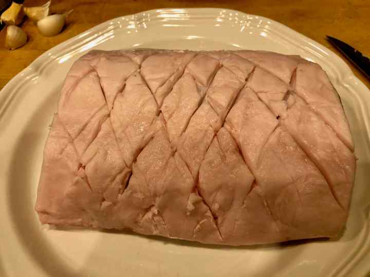 3. Dry the pork loin and score the fat cap in a cross-hatch pattern.