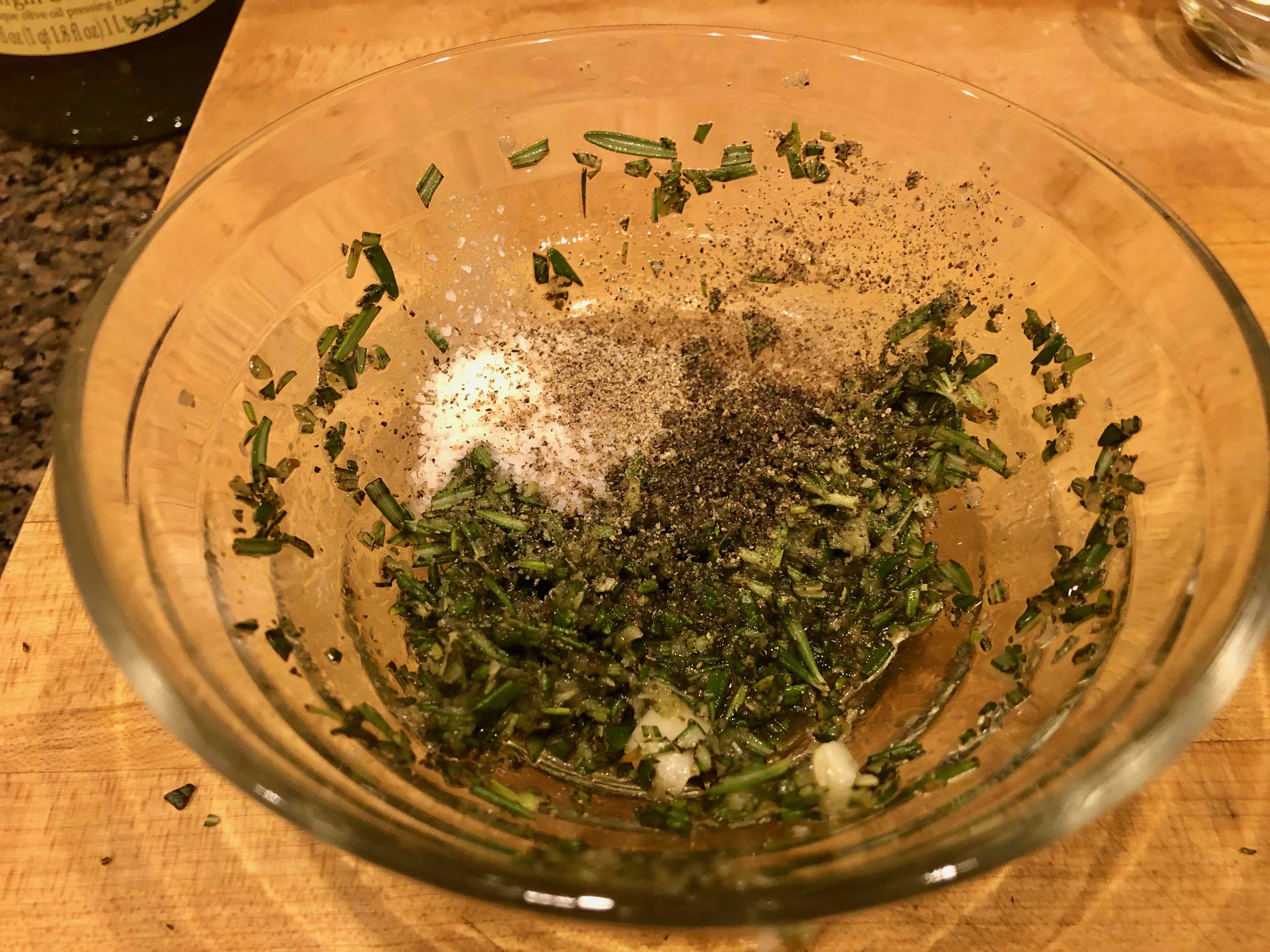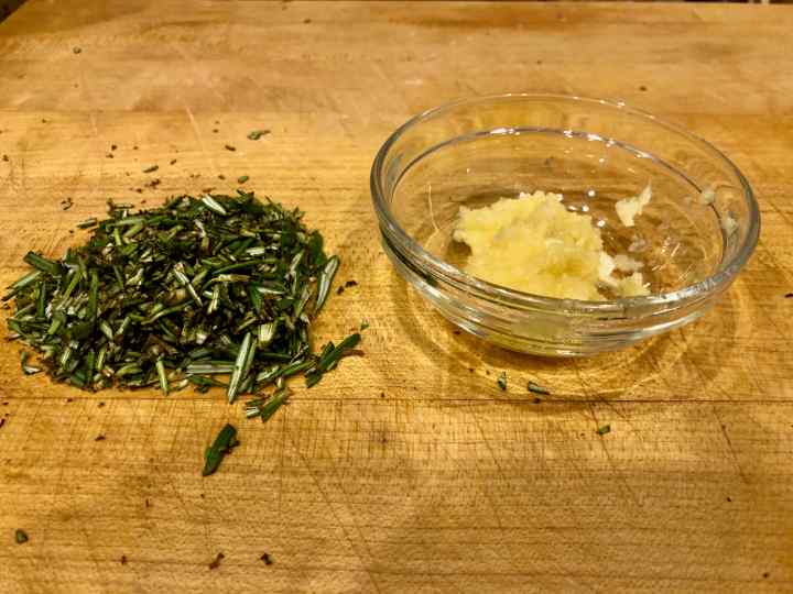 2. Combine the grated garlic, chopped rosemary, salt, and pepper with one tablespoon of the olive oil to form a thick paste.
