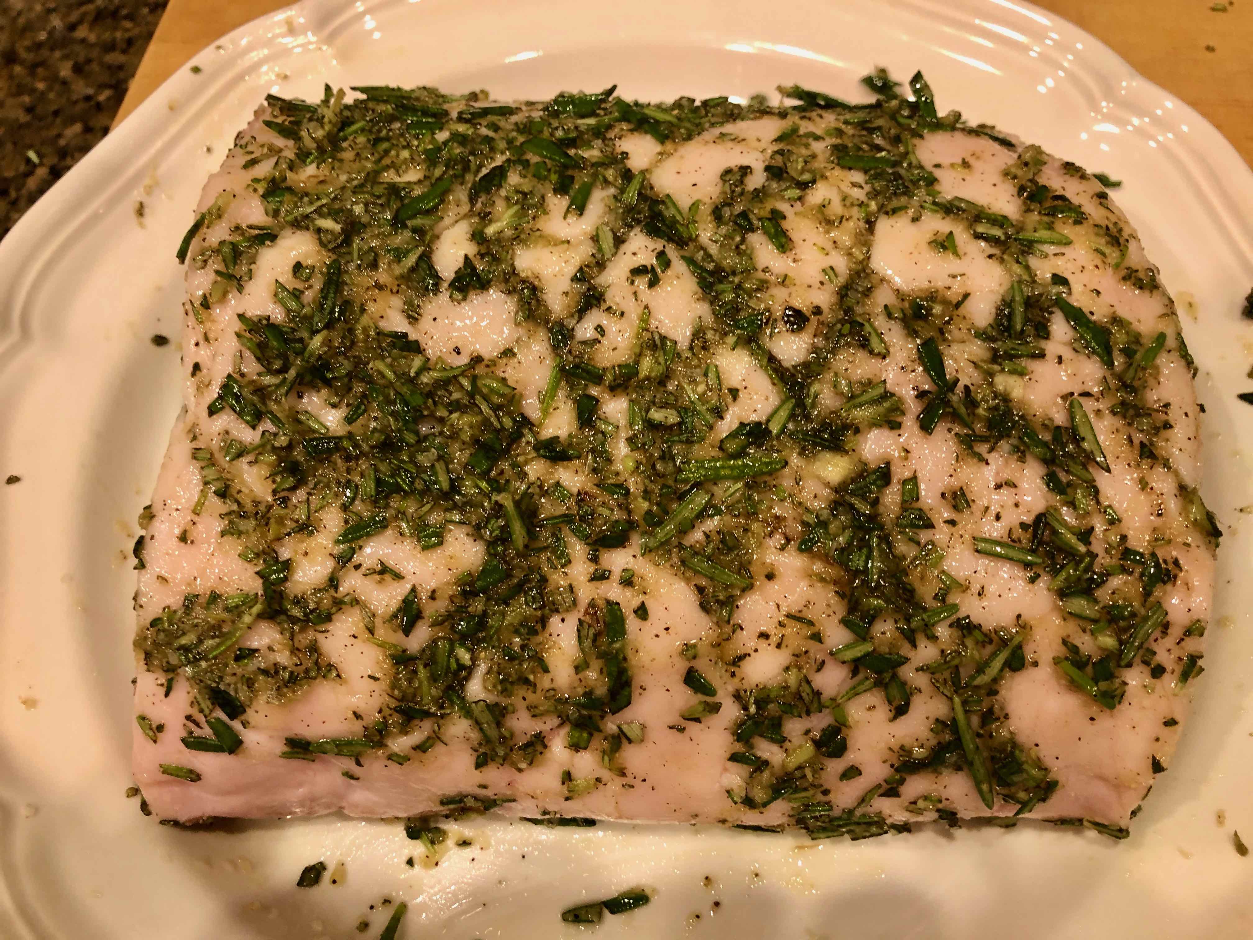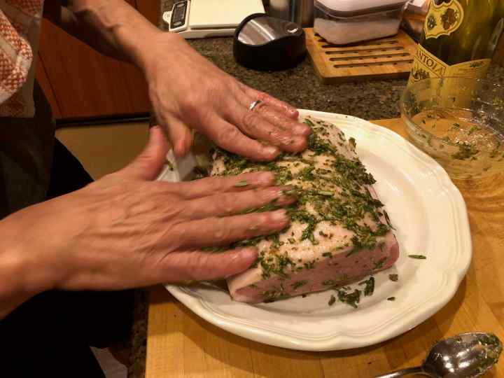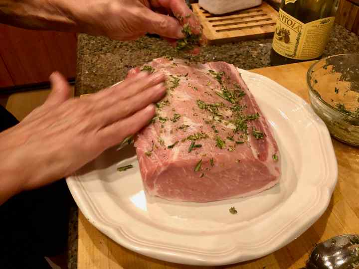 4. Rub the roast all over with the herb paste, pressing most of it into the fat cap.