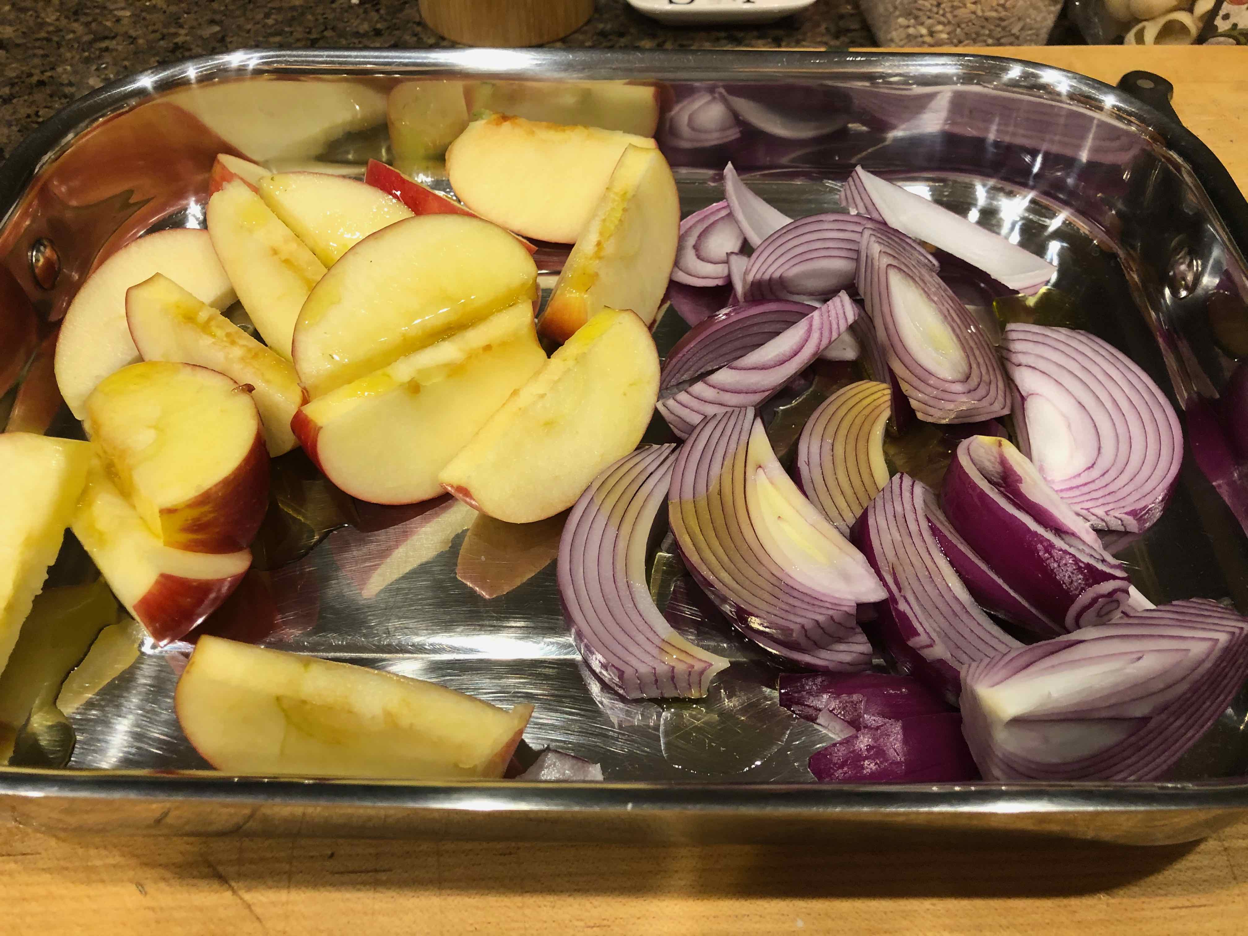 5. Place the sliced apples and onion to the roasting pan and toss with a tablespoon of the olive oil.