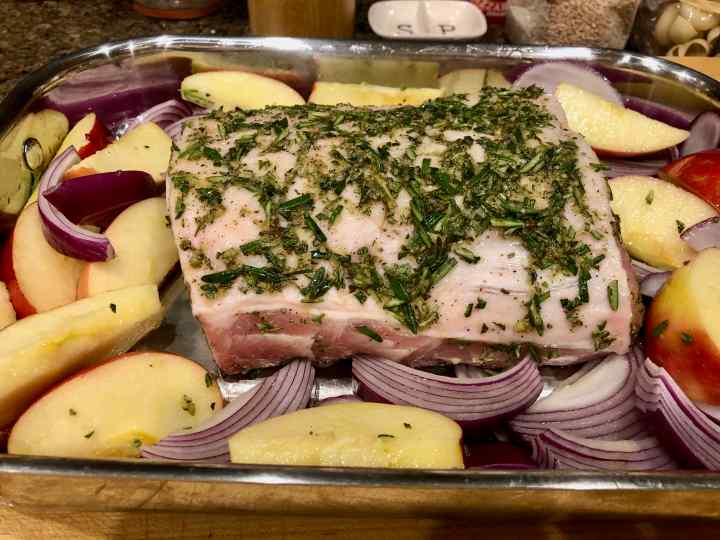 6. Place the roast, fat-side up, in the middle of the apples and onion.