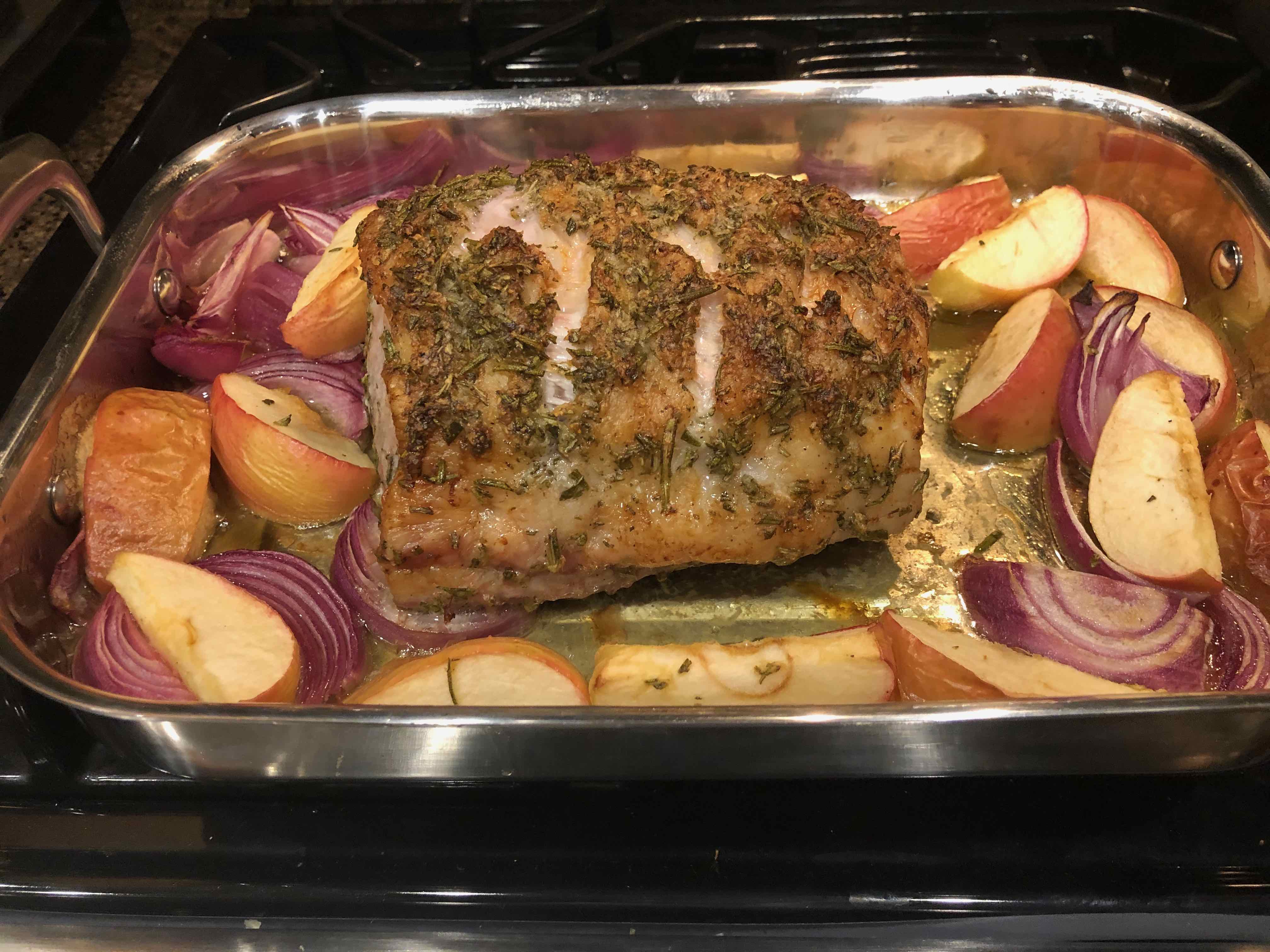 My only problem came with the cooking time. My roast took 90 minutes before it looked done; when I took its temperature, it ranged from 155° to 160°. Even after resting for 5 minutes, however, the roast was deliciously moist with just a hint of pink in the middle. The roasted apples and onion made a perfect accompaniment, with their flavors enhanced by the succulence of the pork.