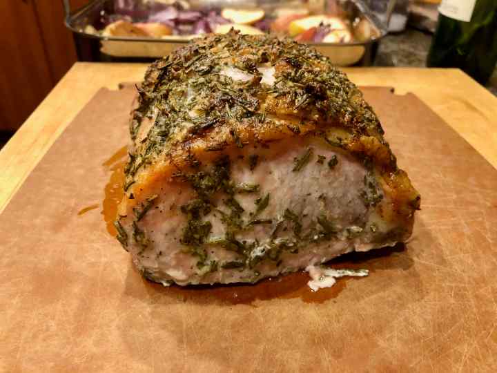 9. Carve into 1/3-inch slices and serve with pan juices on heated plates accompanied by the roasted apples and onion.