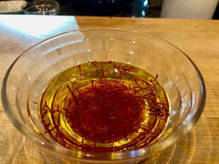 1. Steep the saffron threads in ½ cup hot water and set aside for at least 20 minutes.