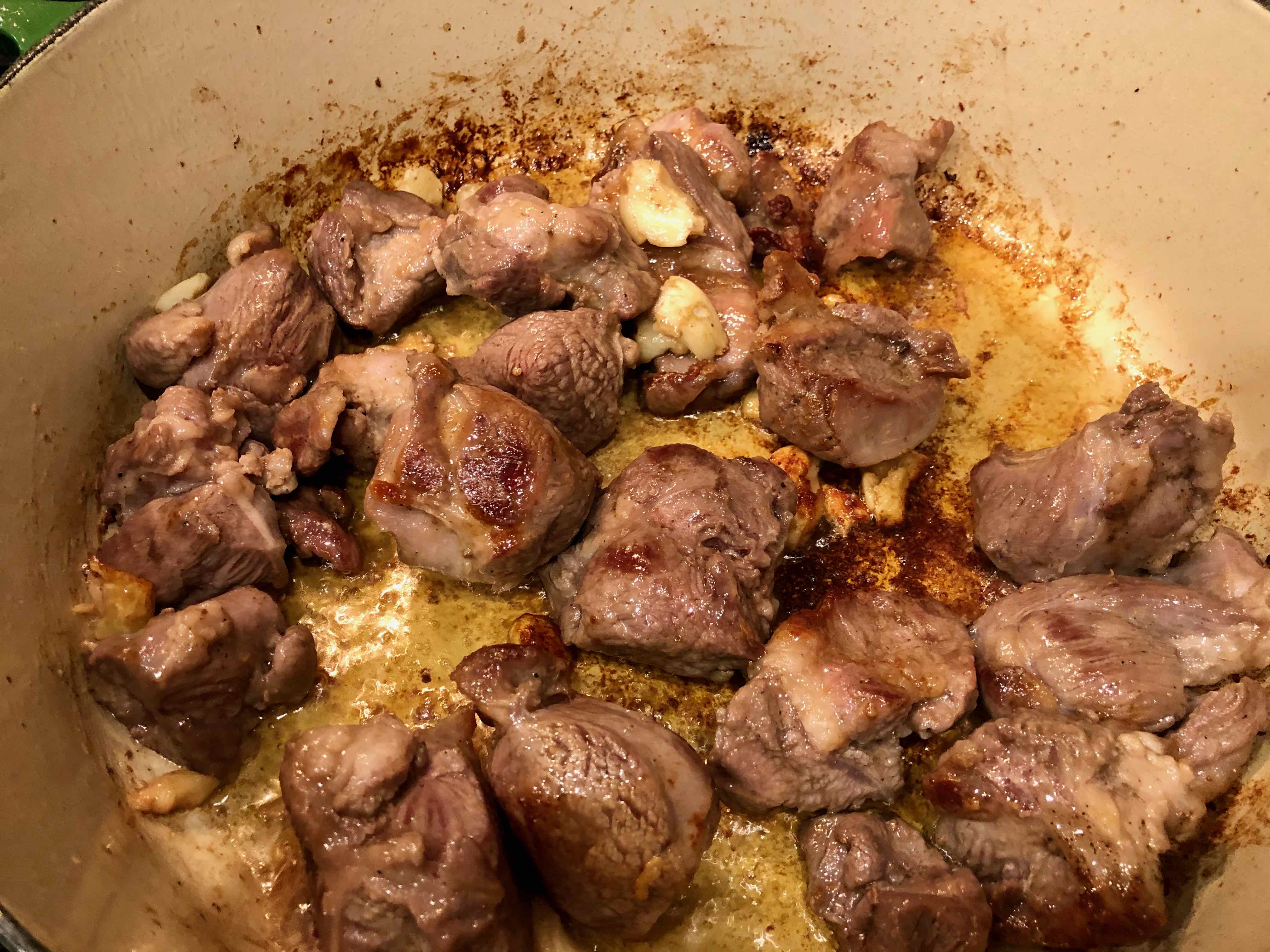 5. When the oil is hot, add the lamb chunks and garlic. (Don’t over crowd the pan; if necessary do the browning in batches.) Sear the meat over medium to medium-high heat, adjusting the flame as necessary to brown the lamb on all sides, being careful not to burn the garlic. About 10 to 15 minutes.