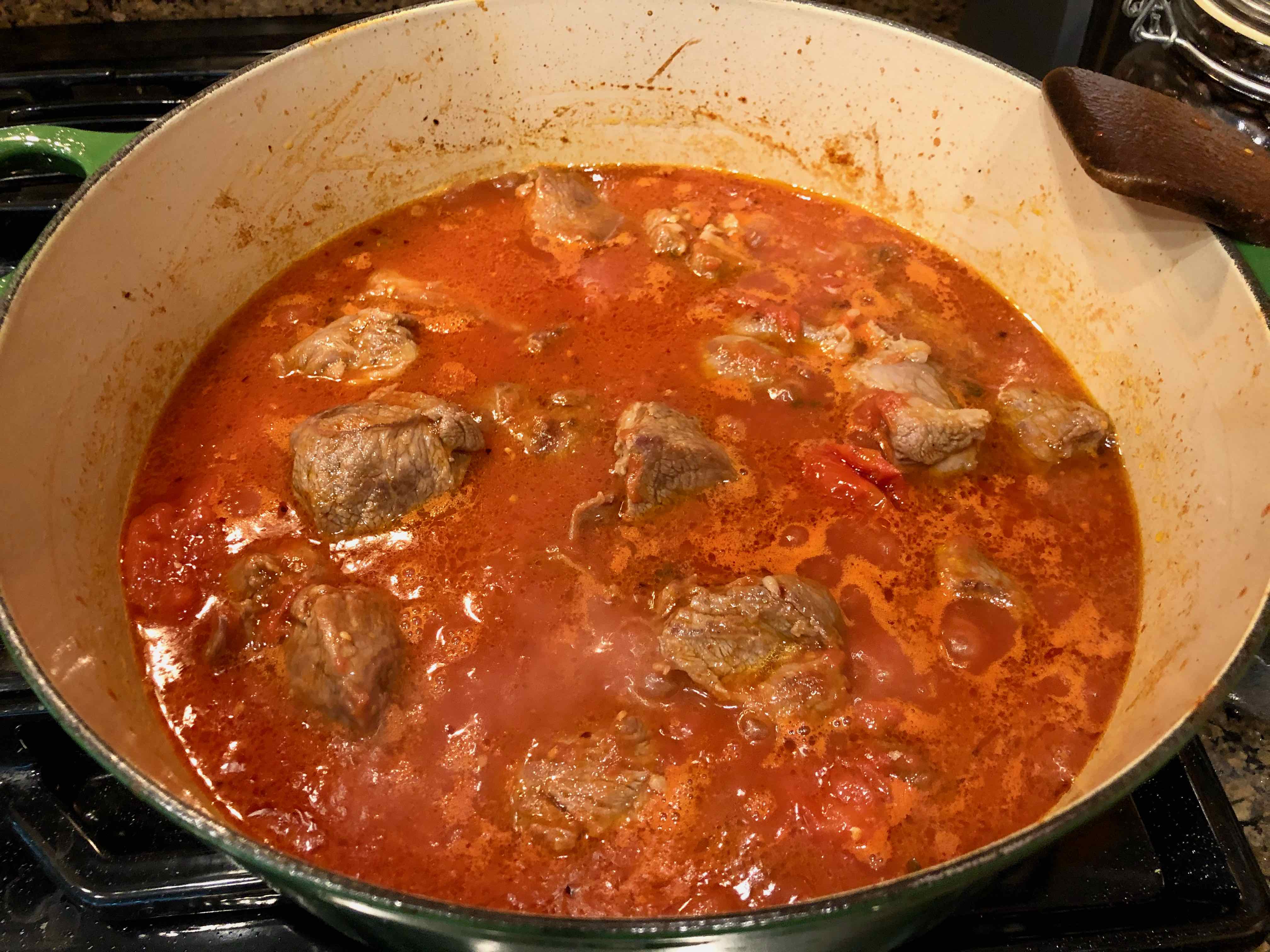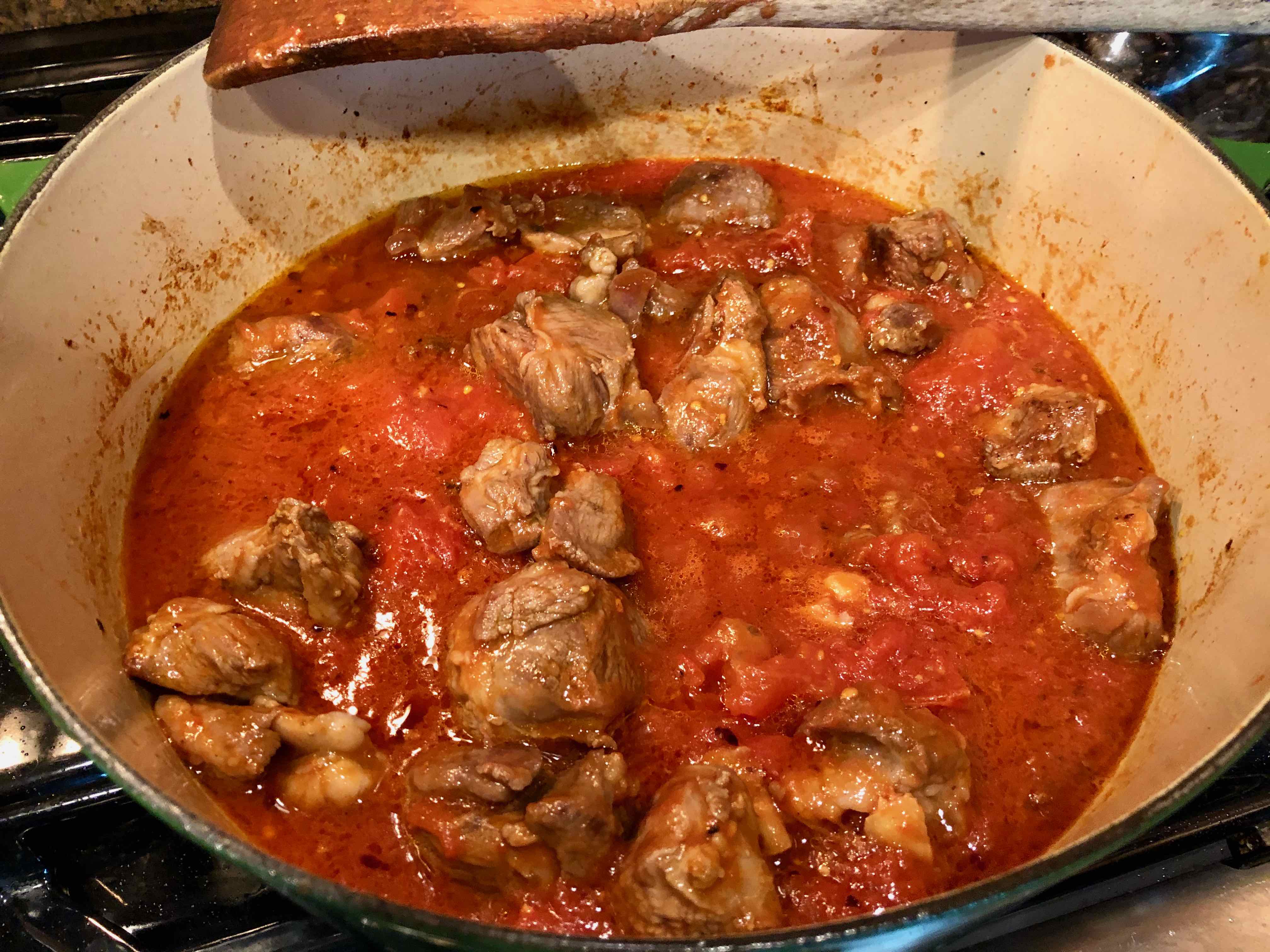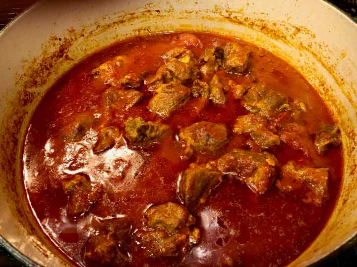 9. Over medium heat, bring to a brisk simmer, and simmer, covered, over low heat, until the lamb is tender. Depending on the lamb, this may take anywhere between 45 to 60 minutes. Test occasionally for tenderness with a fork.