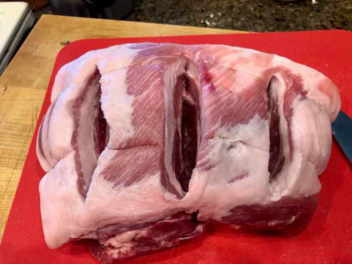 This is where my big problems started; Diane had untied her roast and cut a pocket along the center of the roast. I untied my roast and cut three deep slits across the roast, I think, however, it would have been wiser to unroll the roast, make some cuts within, and then retie it.