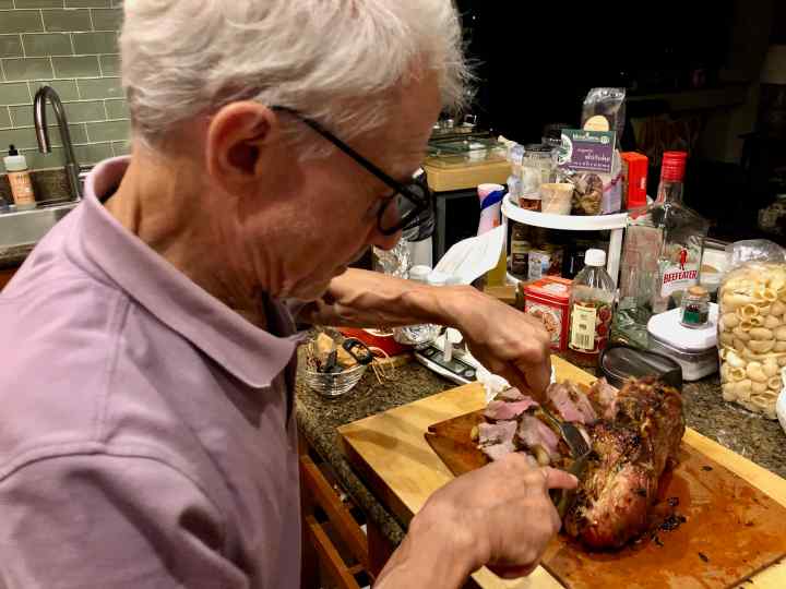 Needless to say, I was disappointed by how my roast turned out; so disgruntled that I refused my husband’s offer to photograph the plated meat. He sneaked this last photo of my carving the roast. In retrospect, however, it really wasn’t all that bad. There was plenty of flavor; the meat was perfectly cooked, but there was a load of fat. Accompanied by some mashed potatoes and buttered peas, it made for a decent meal; just not the show stopper, like Diane’s, that I was hoping for.