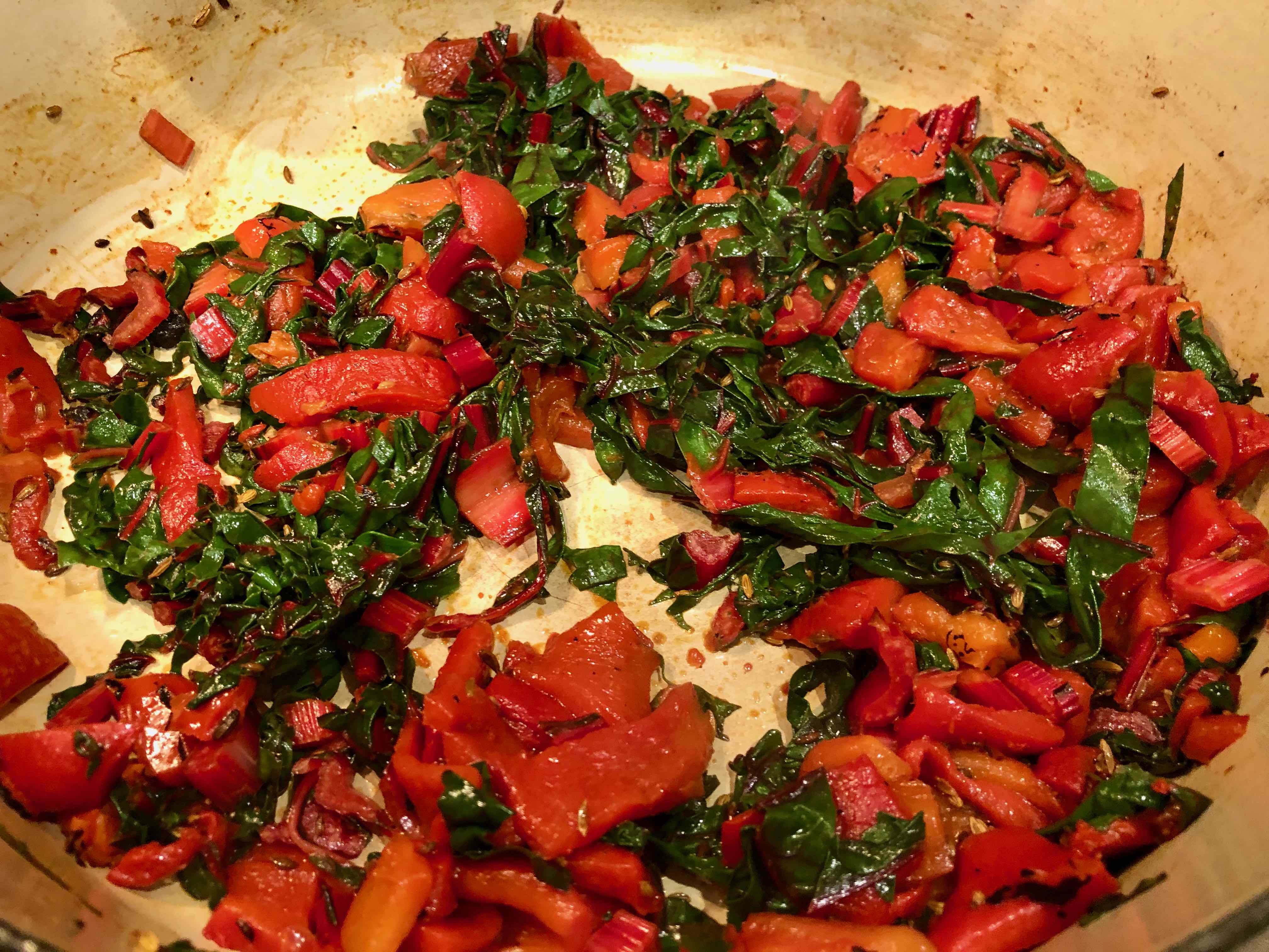 Ingredient availability also necessitated some modifications. Not being able to find a 23-ounce jar of chickpeas, I substituted 2-15-ounce cans. Similarly, since my market’s rainbow chard had seen brighter days, I opted for the red variety.