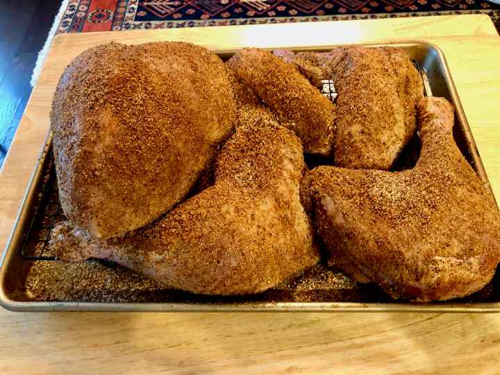 Next came the process that led me to make this recipe: the dry brining that would yield the proffered “expertly spiced” bird. Except for small pieces of meat like chops, I’ve always avoided wet brining. Just the thought of finding a vessel large enough to accommodate a big bird and then the space required in the fridge convinced me that wet brining was not for me.