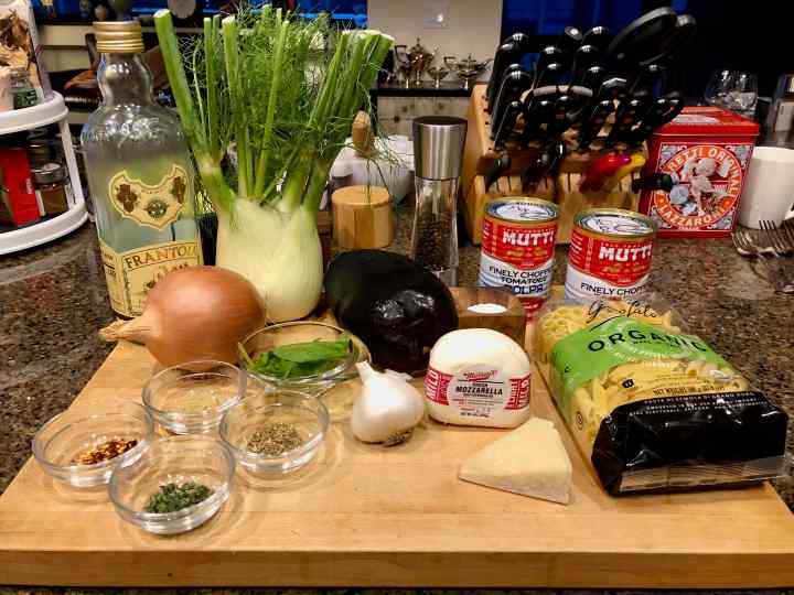 This richly flavored baked pasta, oozing with cheese and laden with succulent eggplant and sweet fennel, made the perfect dish for a rainy winter evening. We chose to serve it with a California Barbera, but any full-bodied, dry red would do well with it.