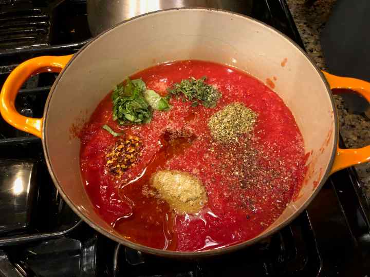 2. Place the tomatoes, along with the reserved rinsing water, pepper flakes, oregano, thyme, basil, olive oil, salt and pepper to a heavy-bottomed sauce pan. Bring to a simmer, and cook uncovered for 15 to 20 minutes. When finished, set aside.