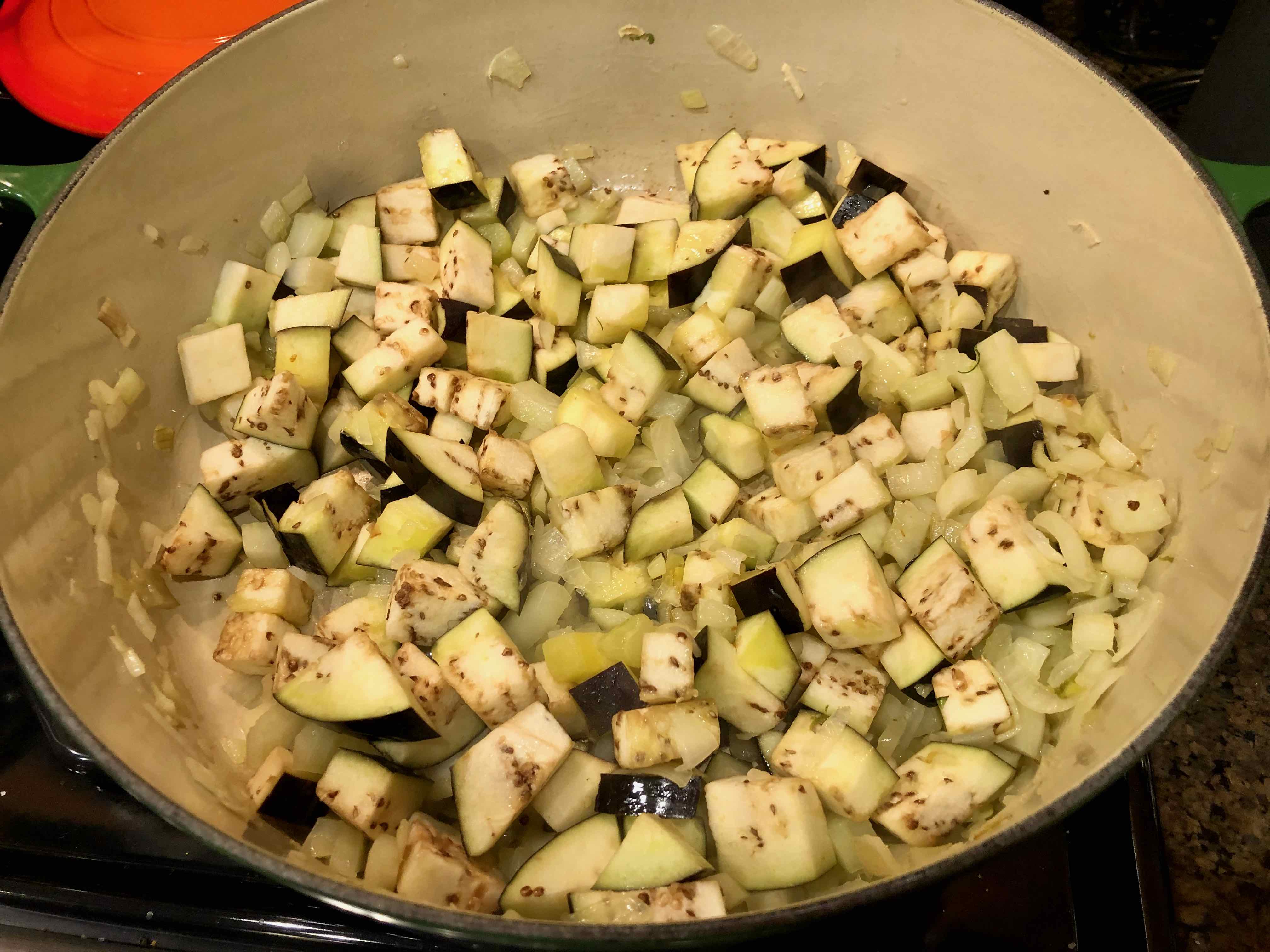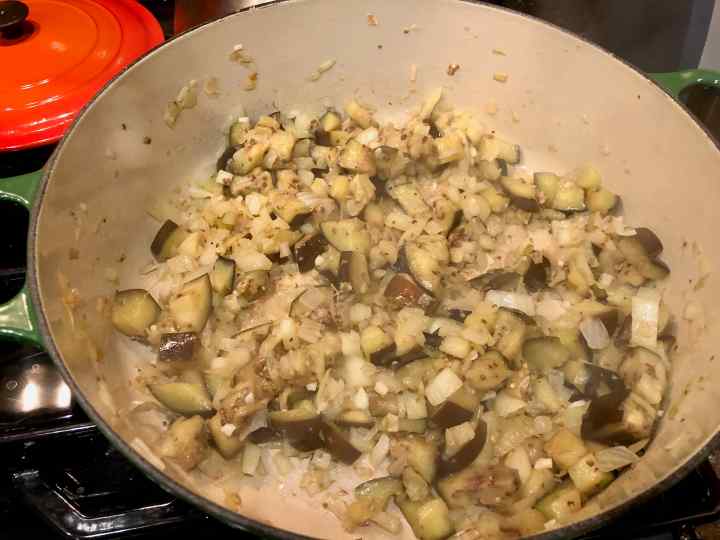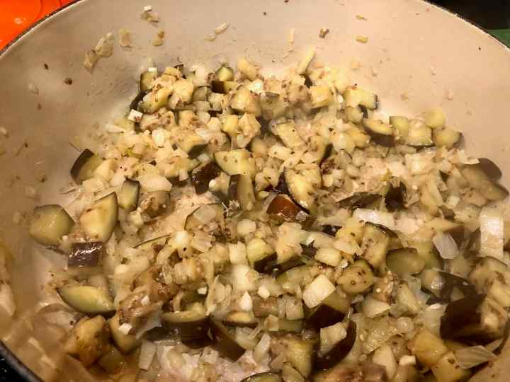 5. Add the eggplant and 1 tablespoon of olive oil and sauté until tender, about 6 to 7 minutes, adding a little more oil if the eggplant is sticking.