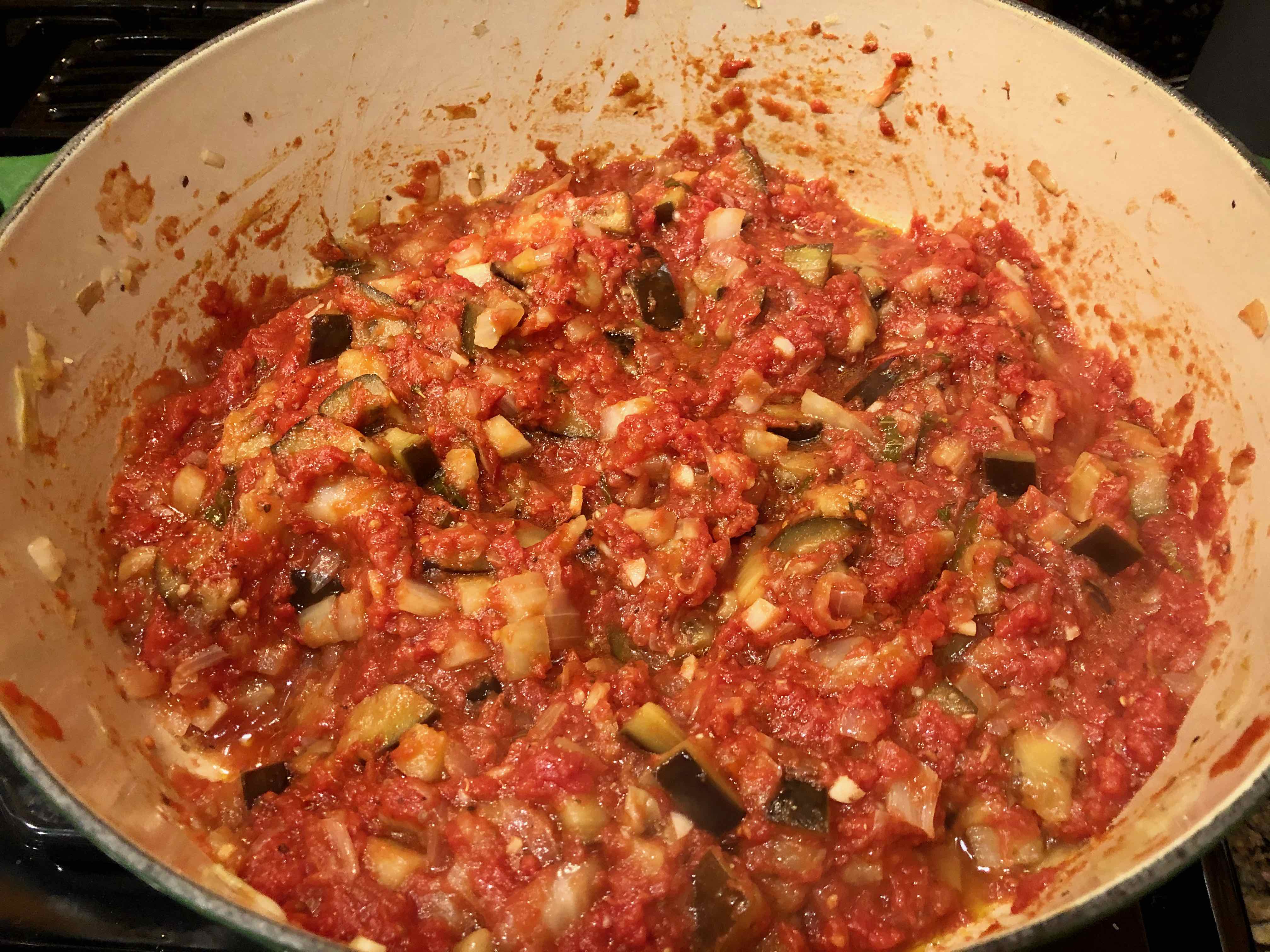 That Ina’s online recipe, as well as her version of it described by Kalpana, is considerably more involved made me appreciate Kalpana’s steps to simplify it in her adaptation. My chief departure from Kalpana’s, however, was using a home-made, as opposed to a store-bought, marinara sauce, which I prepared using the herbs and seasonings for the soup component of Garten’s recipe.