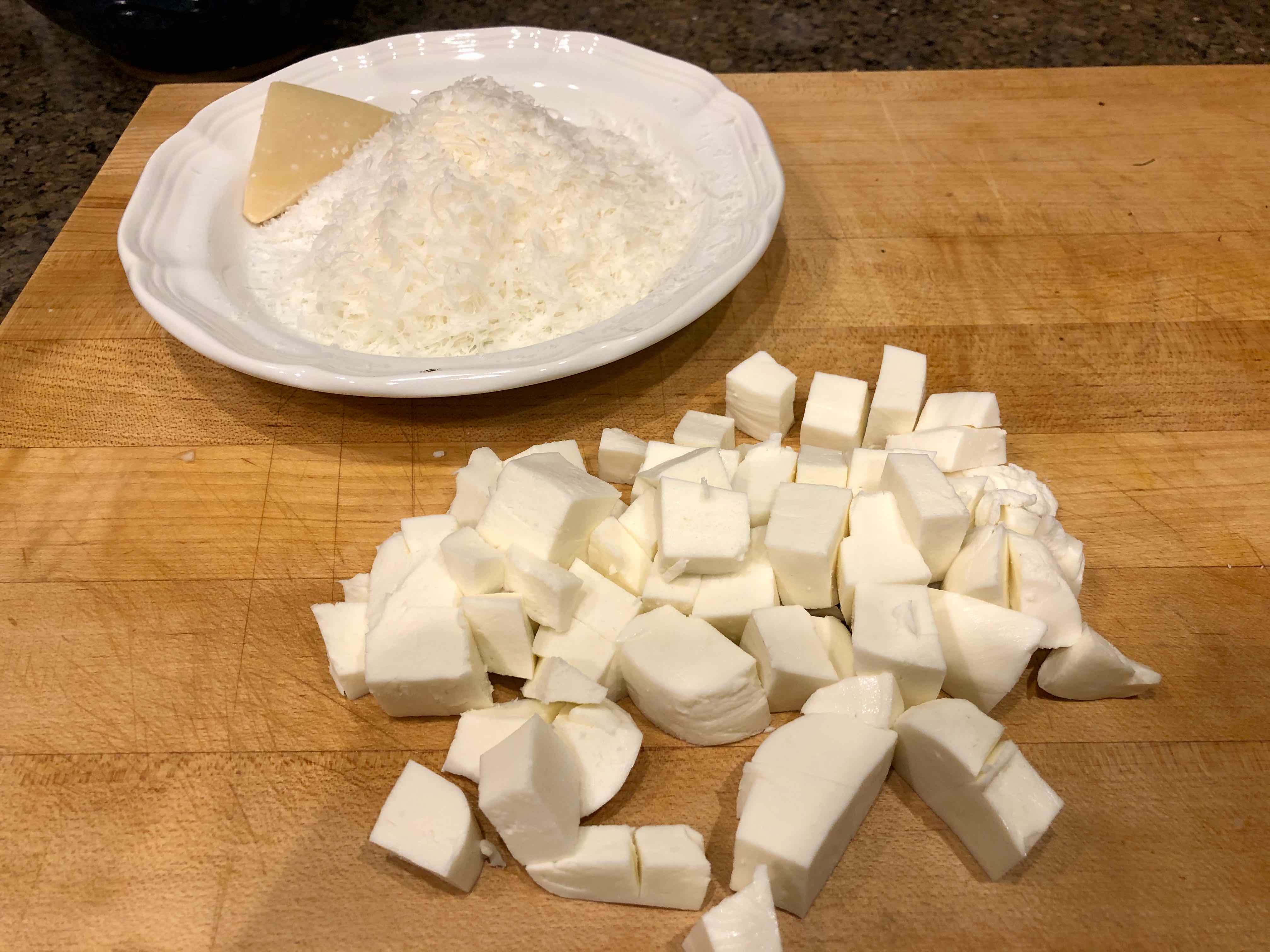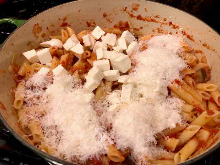 10. Add the mozzarella and one cup of the Parmigiano, and fold into the pasta and vegetables, making sure the cheese is evenly distributed.