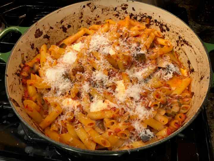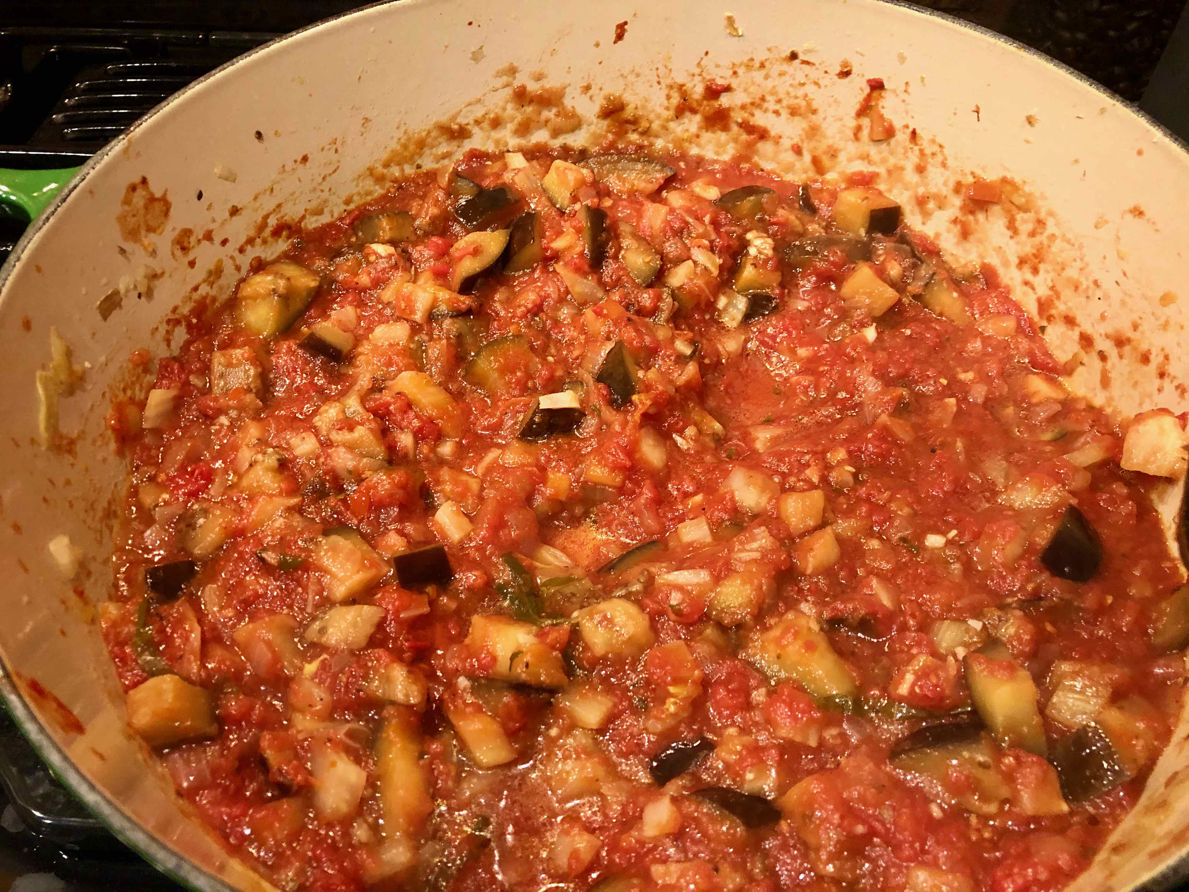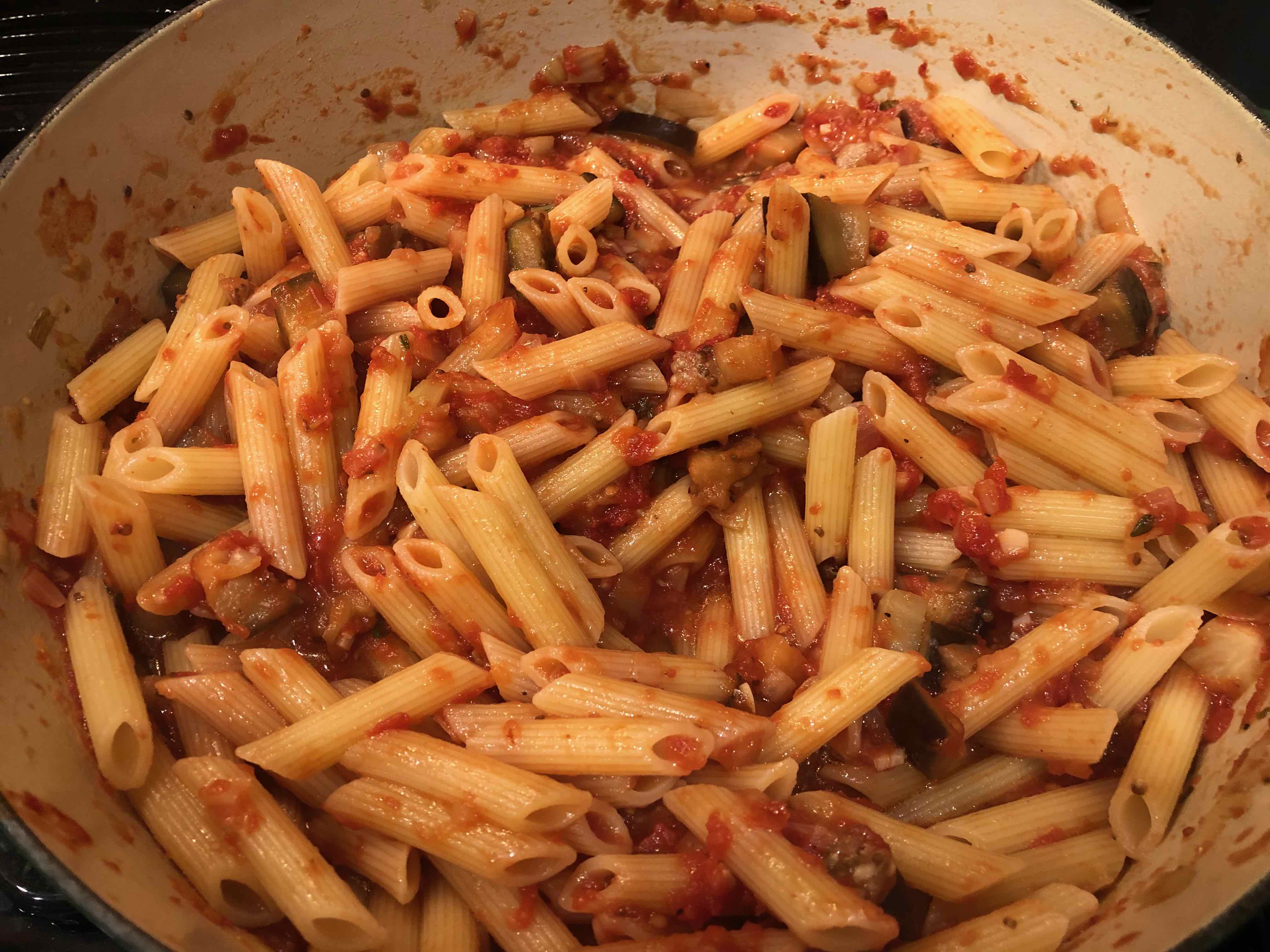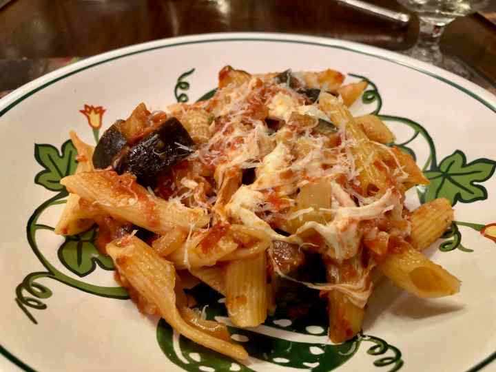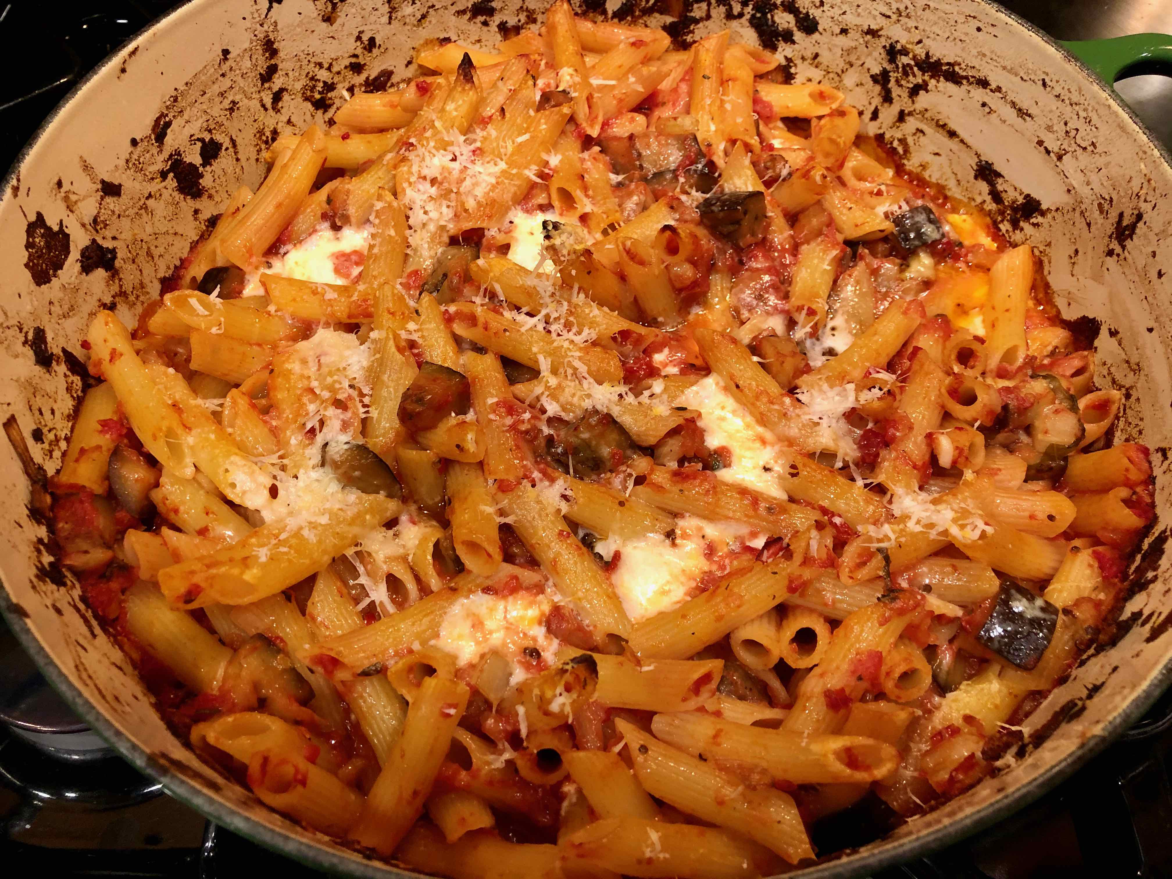 Kalpana’s attribution led me to search for the recipe online, where I found a version of it on Garten’s “Barefoot Contessa” website listed as Baked Pasta with Tomatoes and Eggplant. However, I’m not certain that this is the exact version that Kalpana references as the basis for her own.