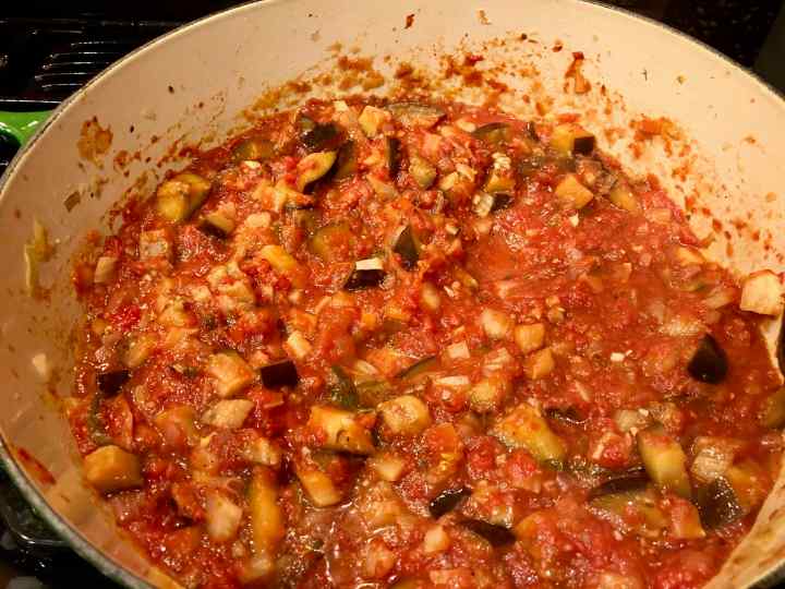 What I especially liked about Kalpana’s approach to the dish was her choosing to cook and then bake everything in an enameled-cast iron Dutch oven, which eliminated using individual gratin dishes or layering in a baking dish.