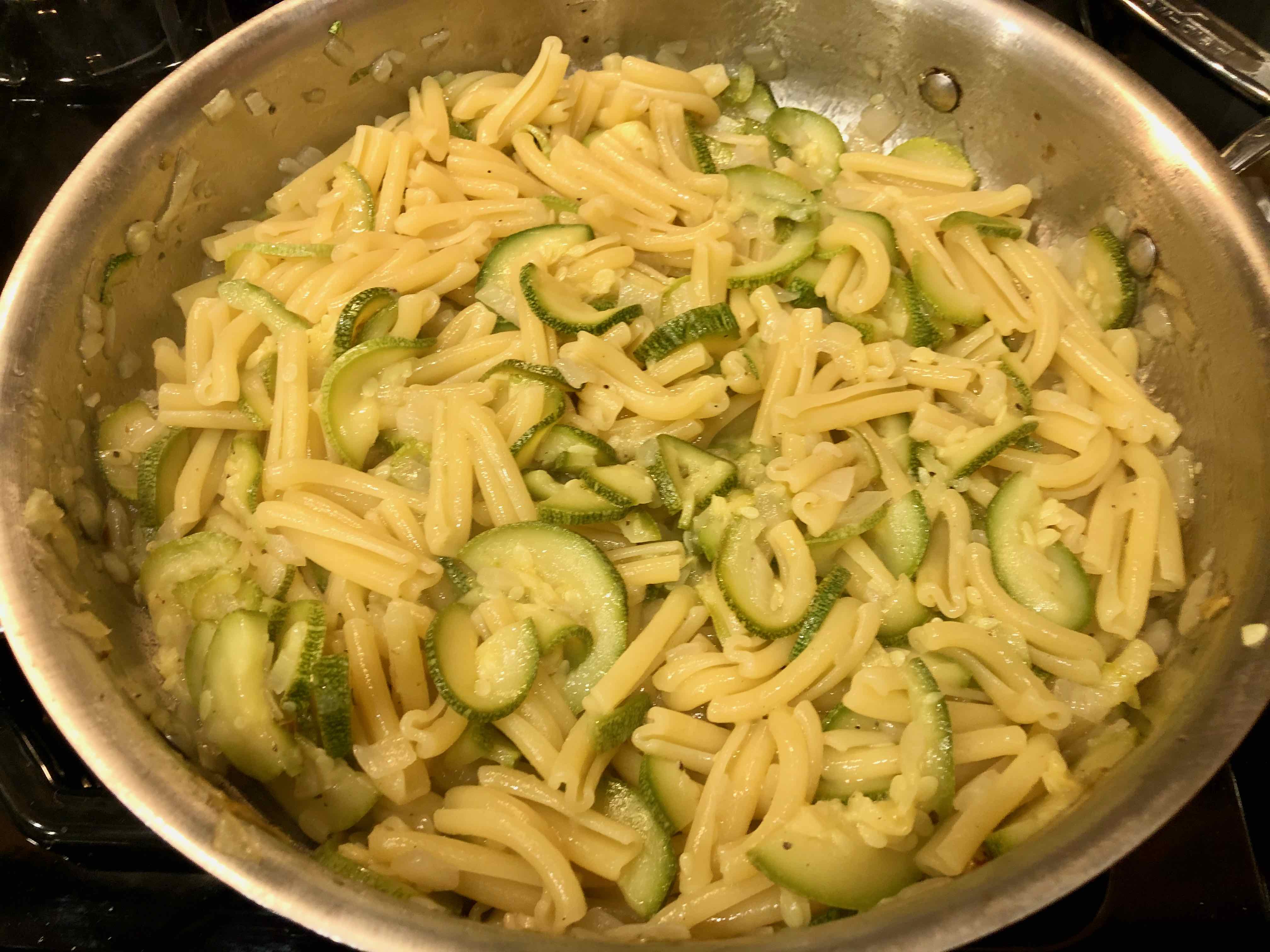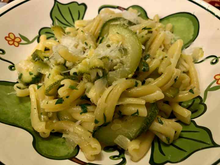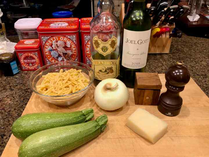 My friend, Italian-wine aficionado Ciro Pirone, recently posted a photo of pasta with zucchini on his informative Twitter feed @Vinofilosofia. It looked so appetizing that I asked him for the recipe. His response: “Senza ricetta…tutto ad occhio (No recipe, all by eye.) I sauté a little onion and then add thinly sliced zucchini, salt and pepper, and cook low, covered; halfway I add half a glass of water and let cook till they fall apart. Toss in the pasta and some parmigiano!”