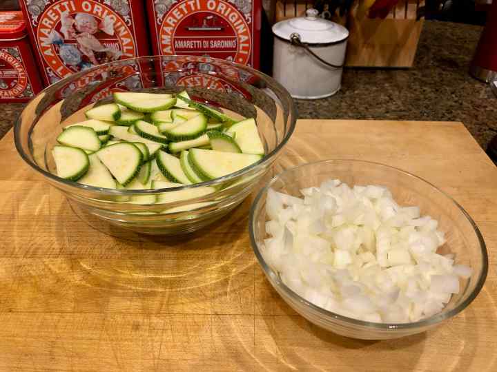 2 medium zucchini, sliced lengthwise and then sliced into thin half moons (see photo below)