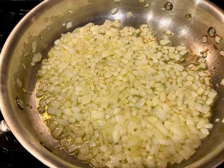 1. In a large sauté pan, sauté the onions with a little salt over medium heat, until soft and translucent, not letting them color. About 7 minutes.