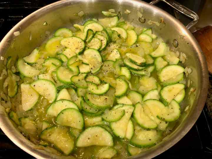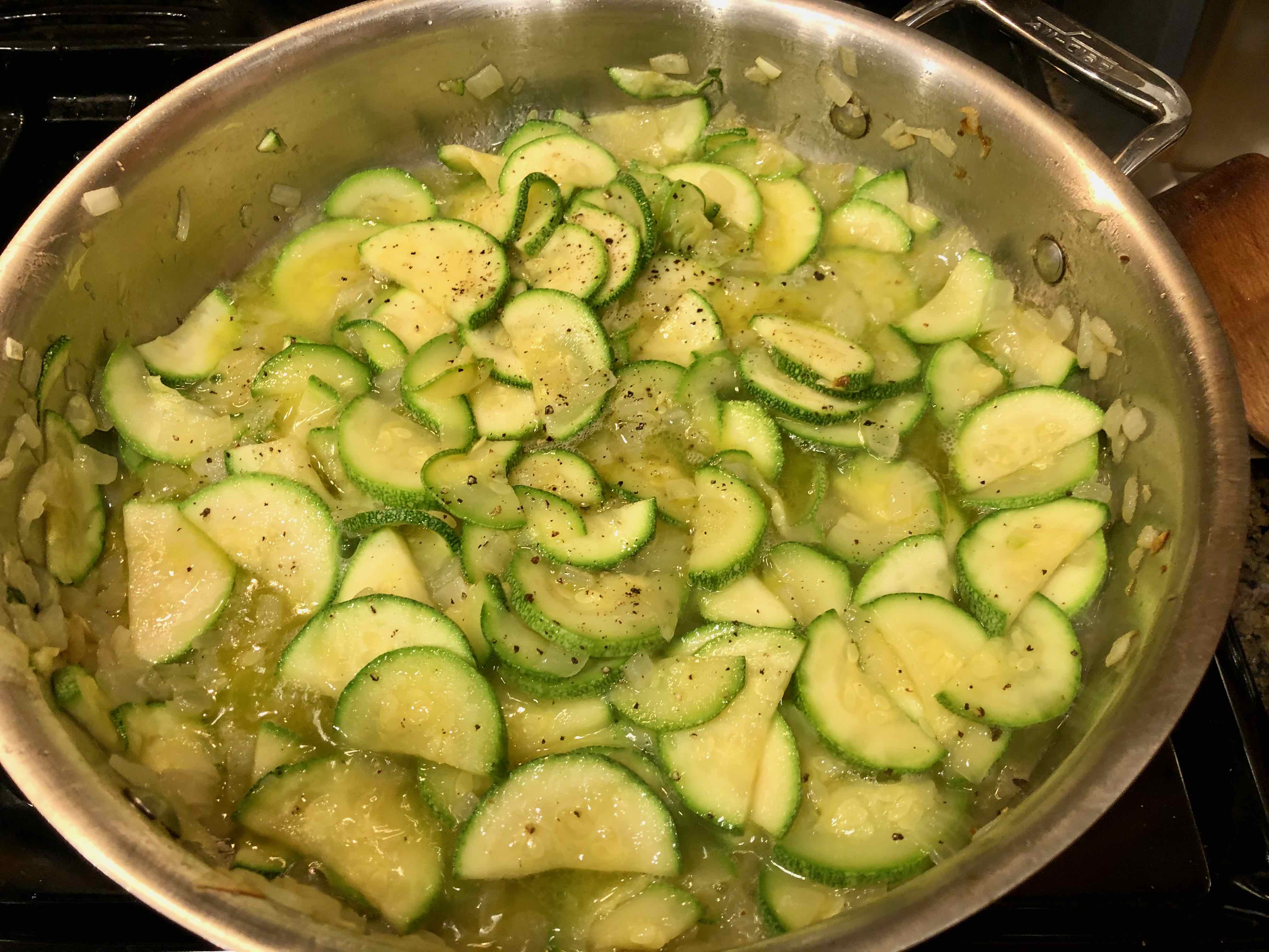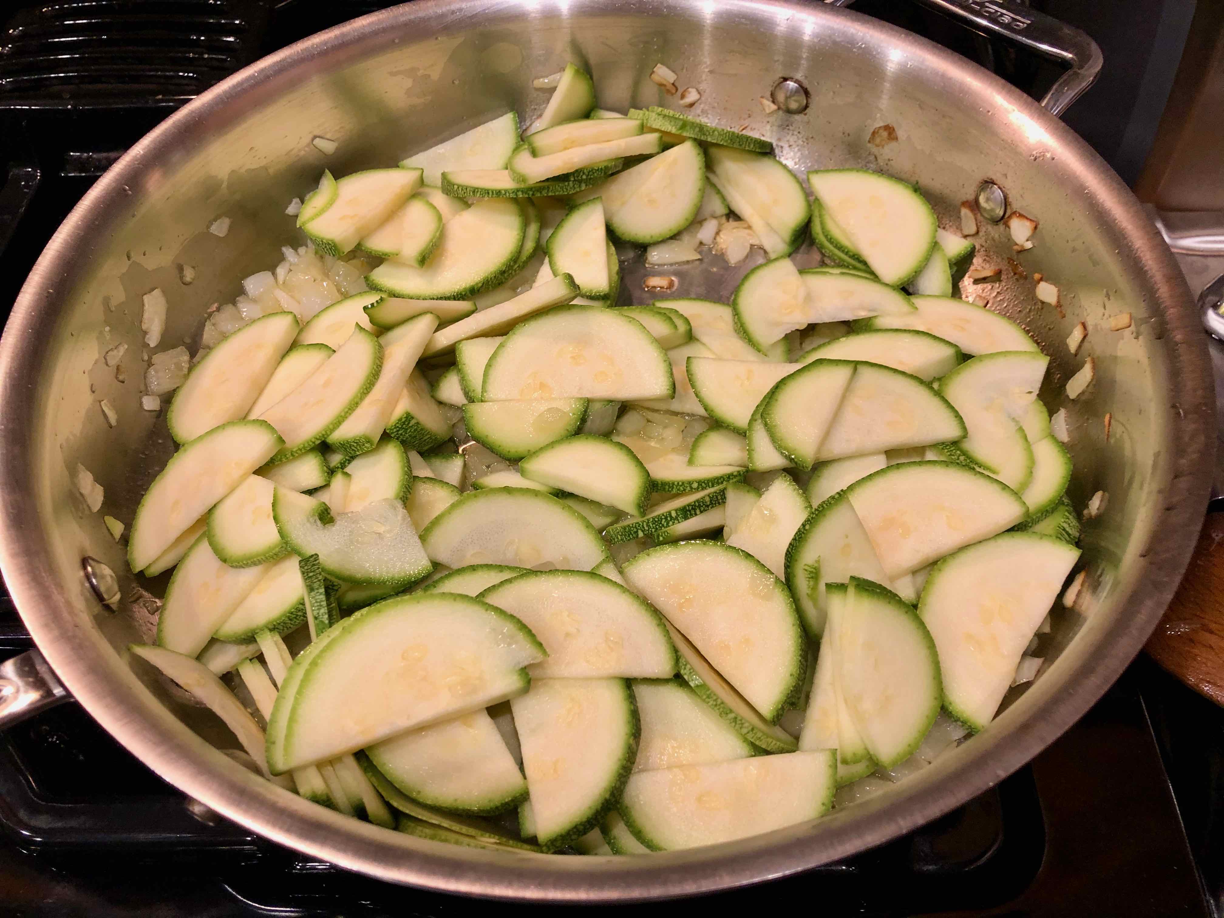 2. Add the zucchini, a little salt, and sauté, stirring occasionally, until they begin to soften. About 7 minutes.