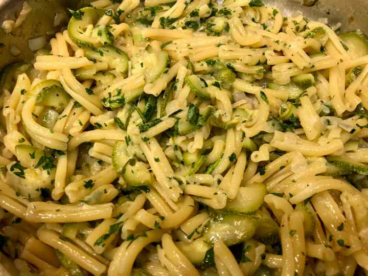 The only variations I made from the original recipe was adding a little wine after sautéing the zucchini, substituting Pecorino Romano for the Parmigiano, and garnishing with a sprinkle of parsley. And perhaps next summer, when they are available, I’ll add some chopped zucchini blossoms to the sauté.