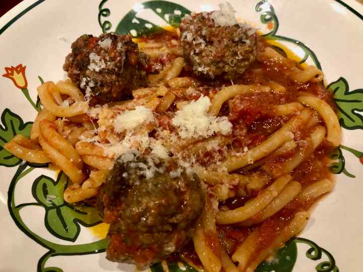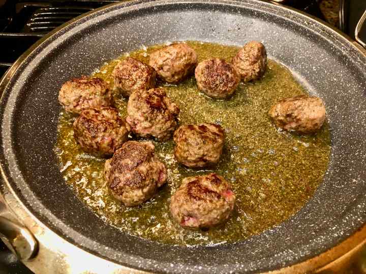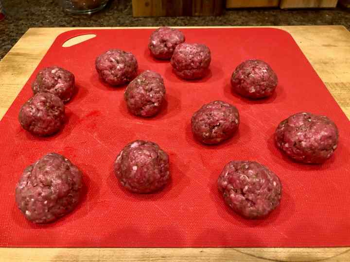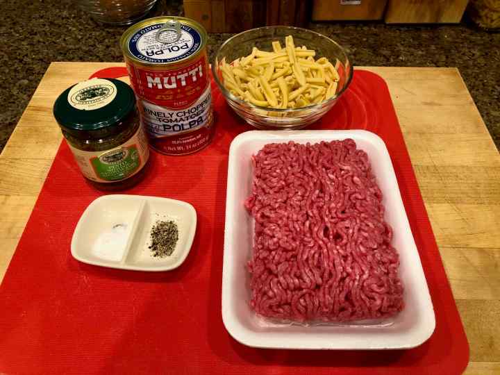 Although we didn’t have the required buns and mozzarella, we did have ground beef in the fridge and jarred pesto and tomatoes, as well as pasta, in the pantry. Andrew, who had recovered from the day’s challenges faster than I suggested pasta and meatballs and before I could object set out the ingredients, photographed them, and said: “Your next blog post.”