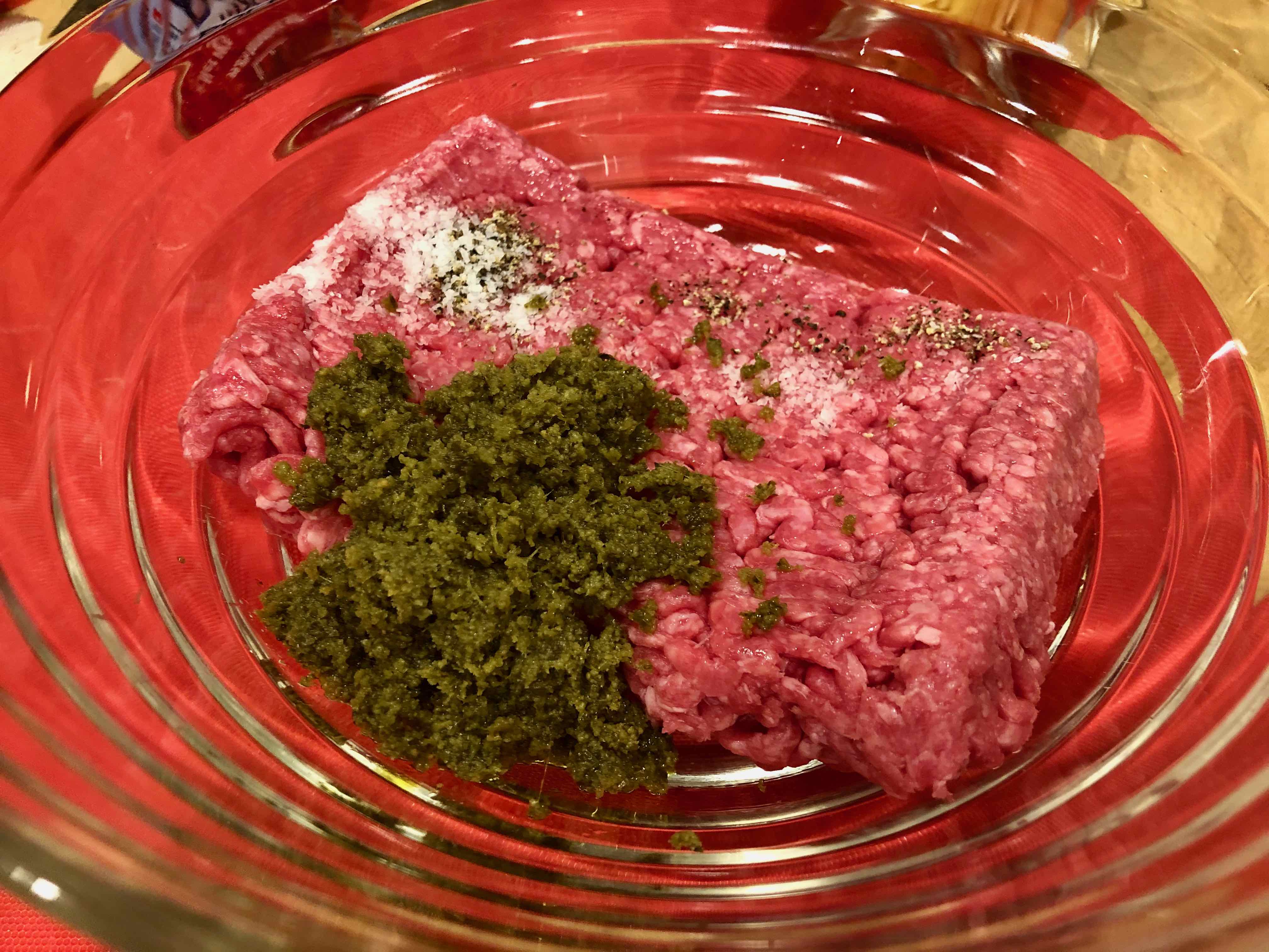 1. Use your clean hands to scrunch the minced beef with the pesto and a pinch of sea salt and black pepper. Be careful not to overwork the meat.