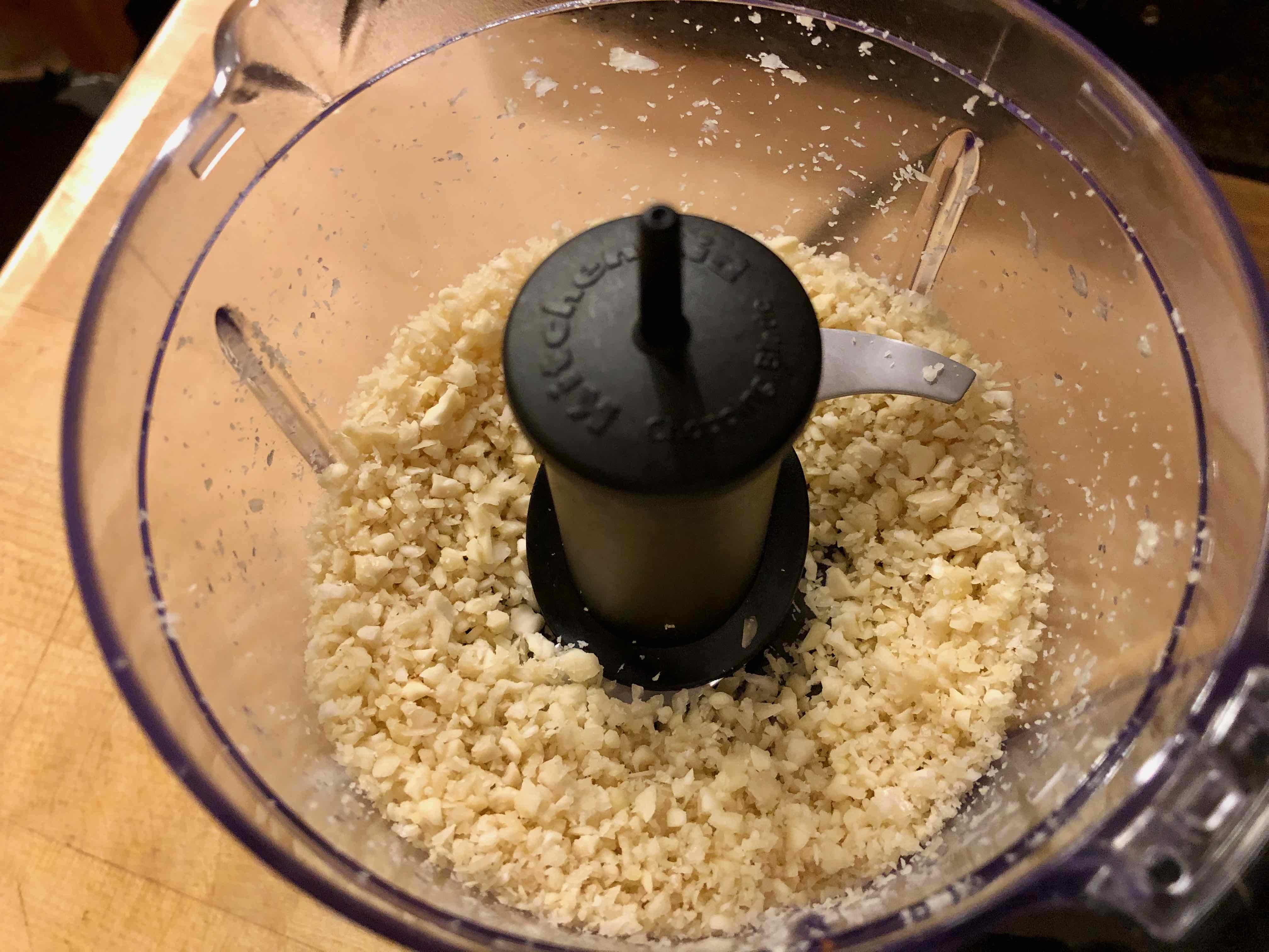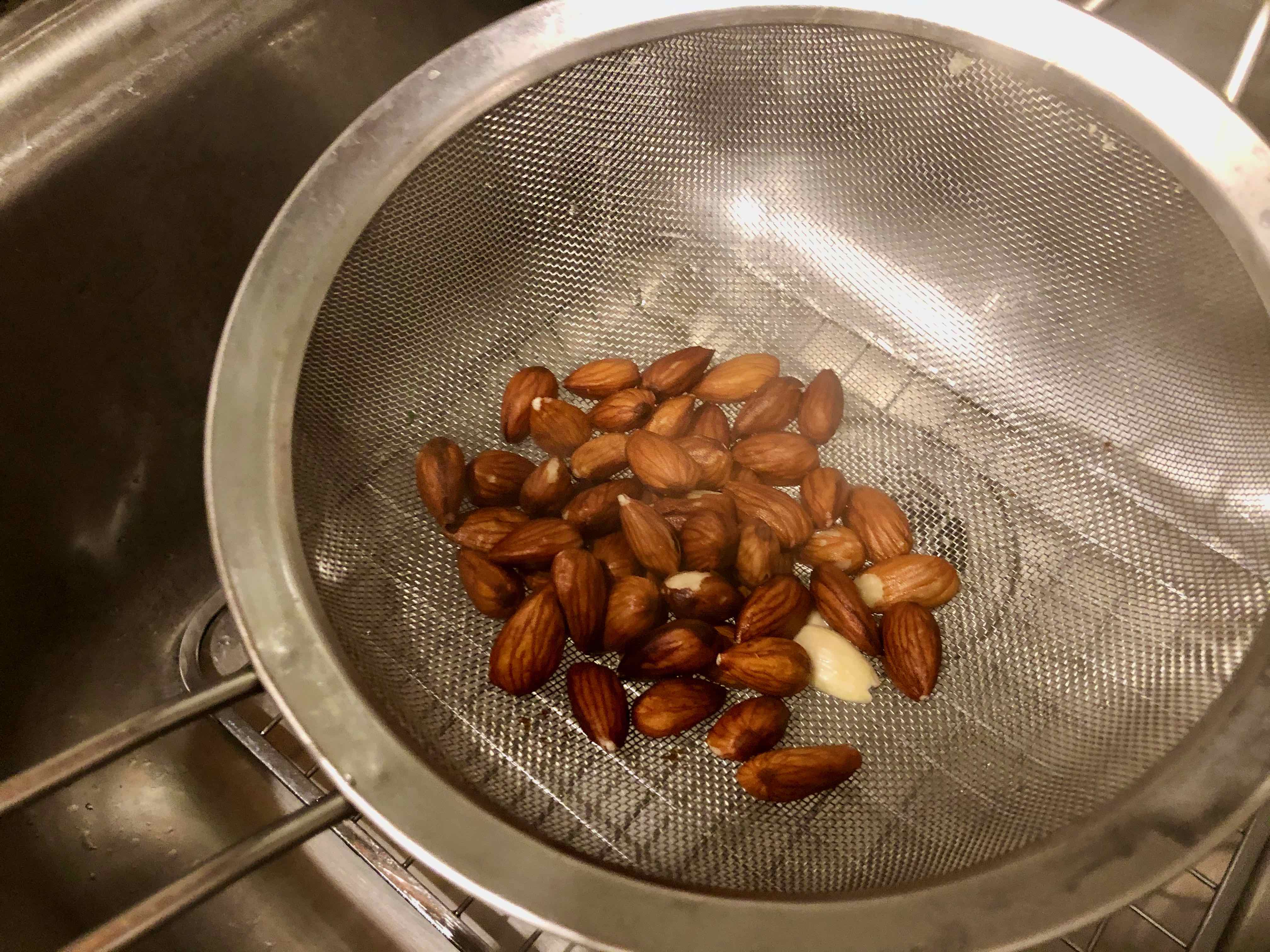 2. Drop the almonds into a small saucepan of boiling water. Two minutes after the water returns to a boil, drain through a sieve. Wrap the almonds in a dampened dish towel. Rub the almonds briskly in the towel, unwrap the towel, and remove those almonds with loosened peels. Remove the peels. Wrap up the remaining almonds and repeat the rubbing procedure until all the almonds are peeled. Put the almonds in a food processor fitted with the steel blade and chop until pulverized. (I found that after drying, it was easier to peel the almonds by pressing the thick end between my thumb and index finger.)
