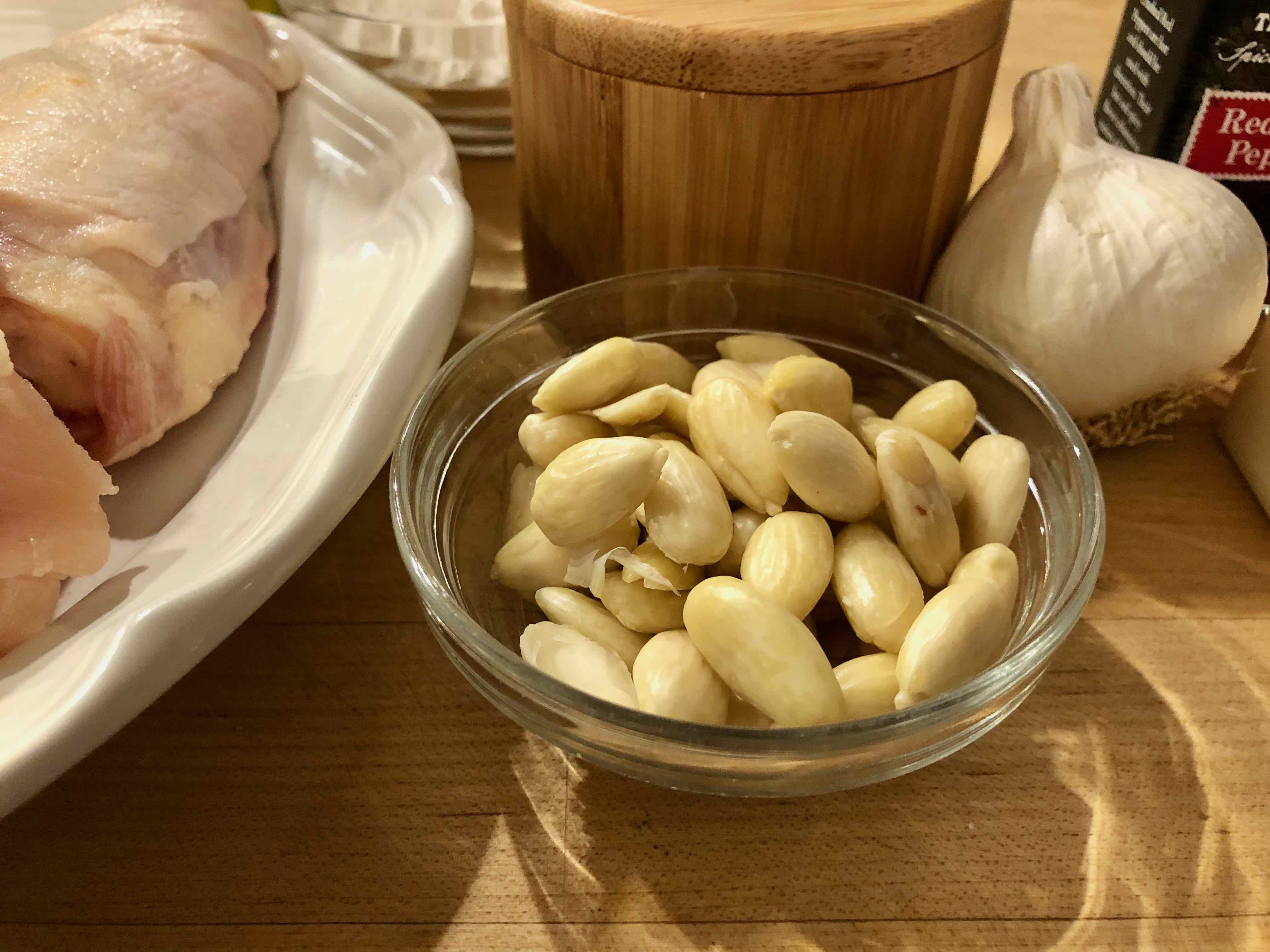 Except for the almonds, I pretty much had everything on hand. And while the recipe called for cutting up a whole chicken, I opted to use four hefty thighs that I had in the freezer. What initially intrigued me about this recipe was its extended cooking time over the lowest heat for the fricassee: an hour and fifteen minutes, or, as she says “for as long as necessary for the meat to come easily off the bone.”