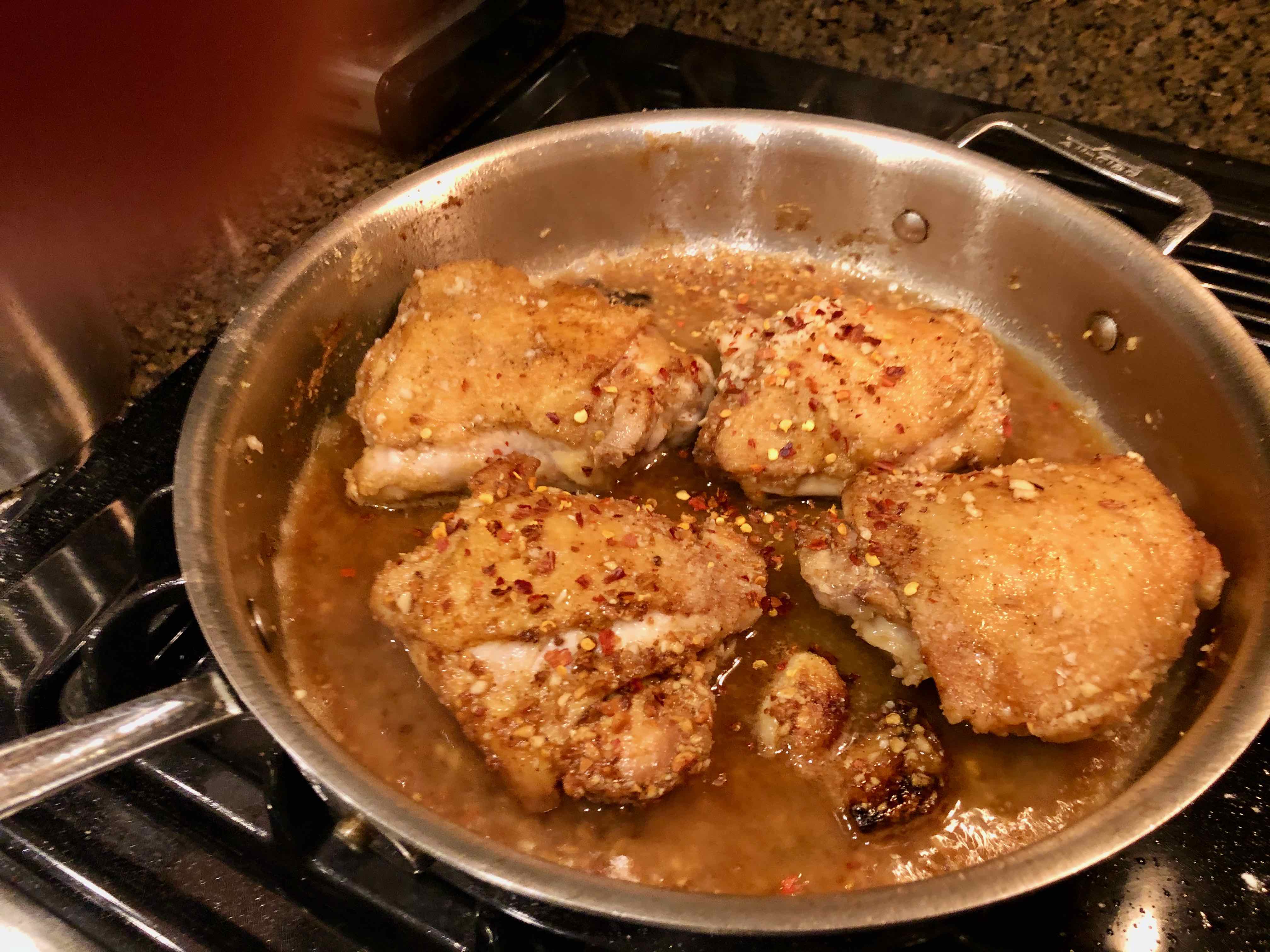 1. Wash the chicken pieces under cold running water, then set in a footed colander to drain. (Following more contemporary guidelines, I skipped the washing, but dried the chicken thighs well with paper towels.)