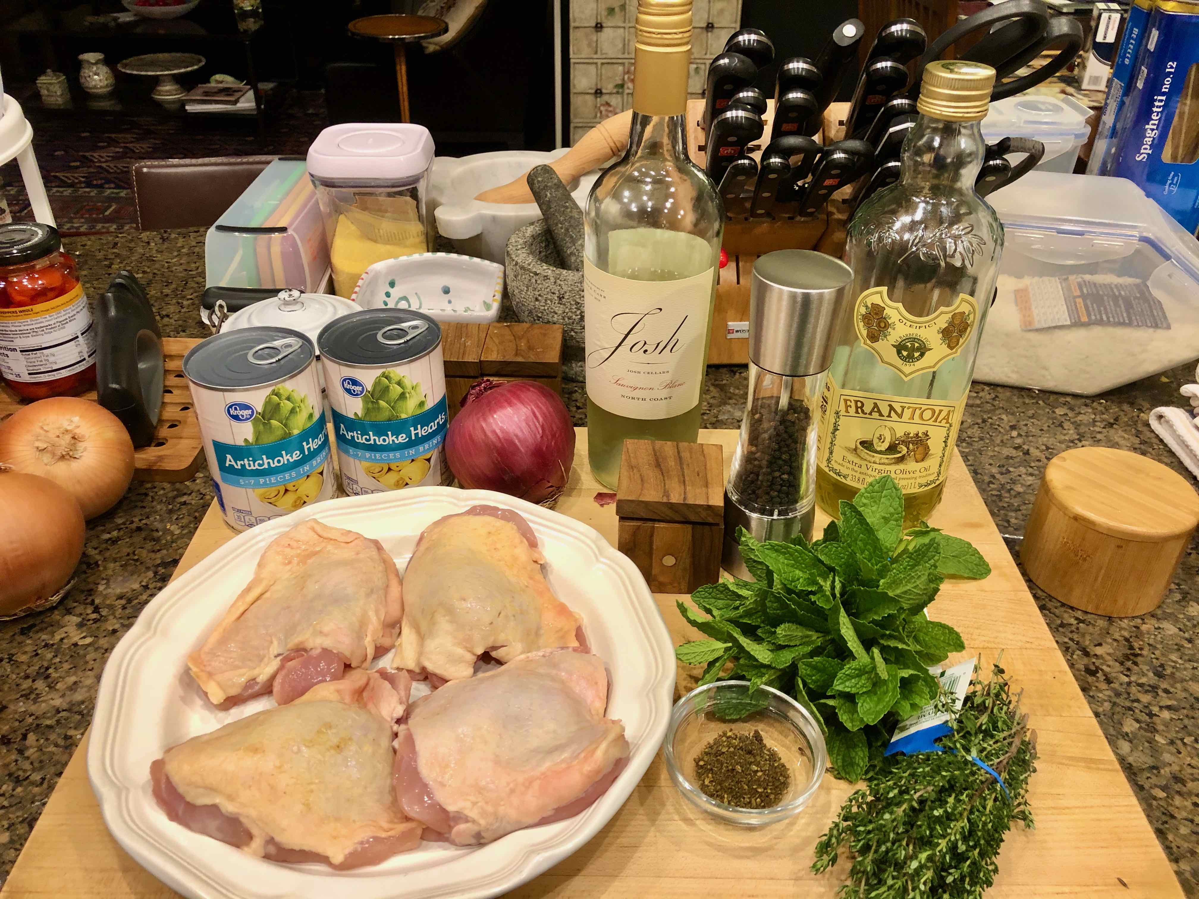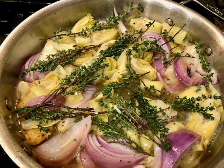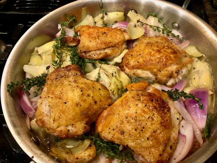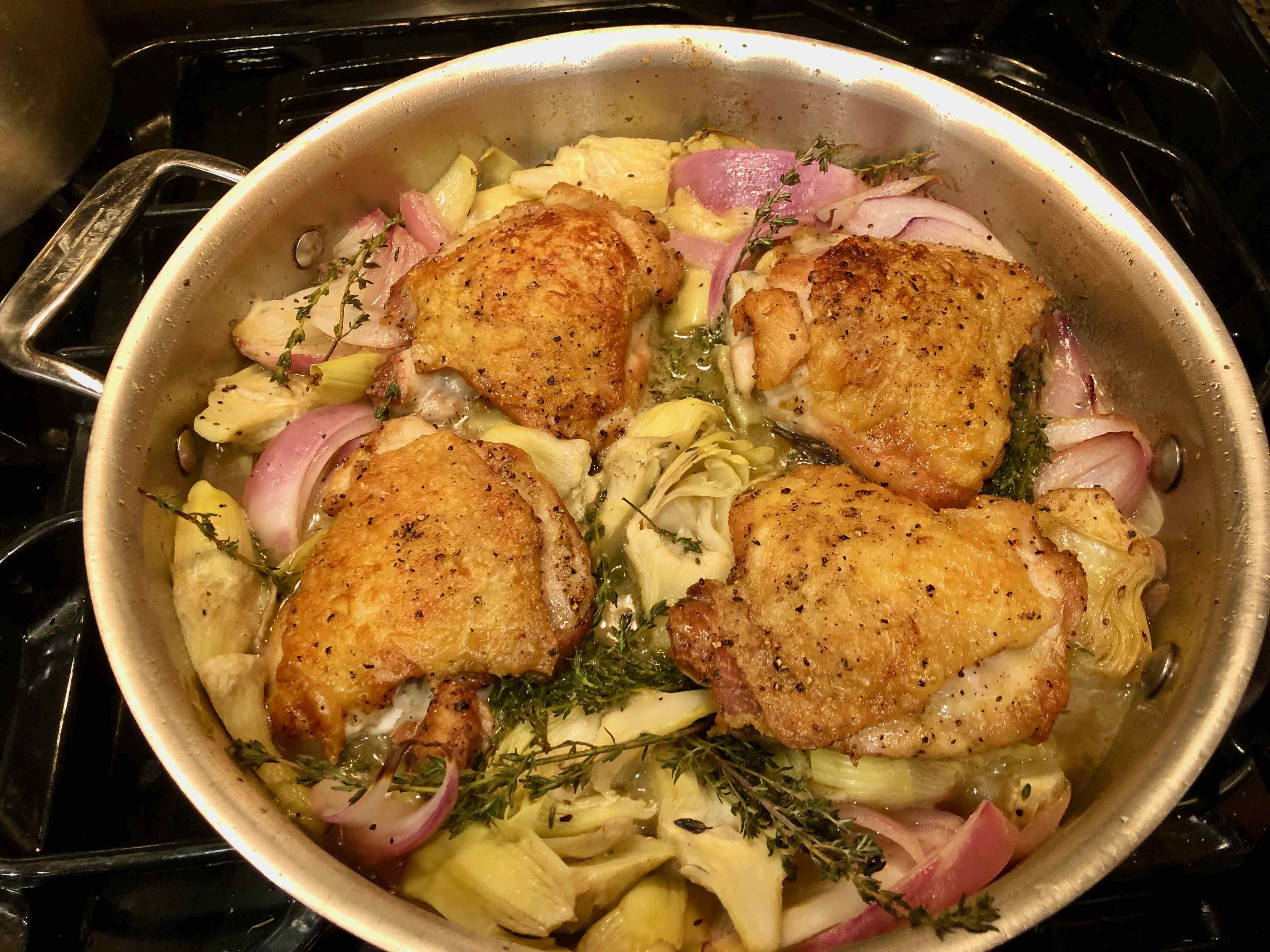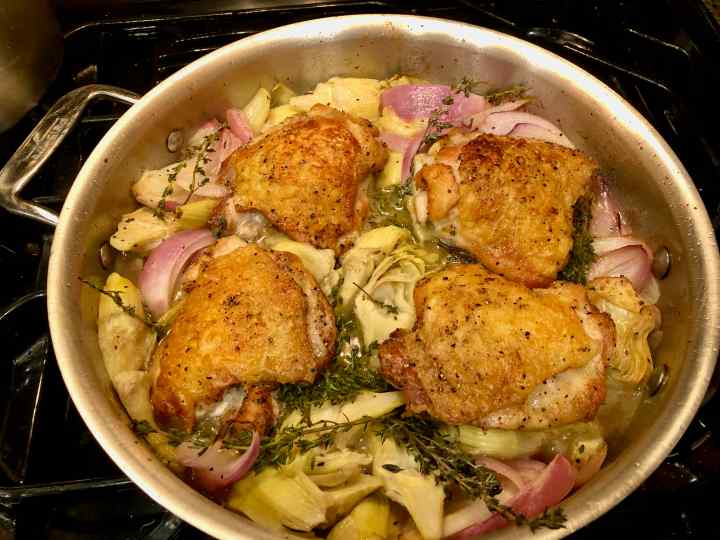 Wine-Braised Chicken with Artichoke Hearts (adapted from a recipe by Alison Roman from the New York Times “Cooking” website.)