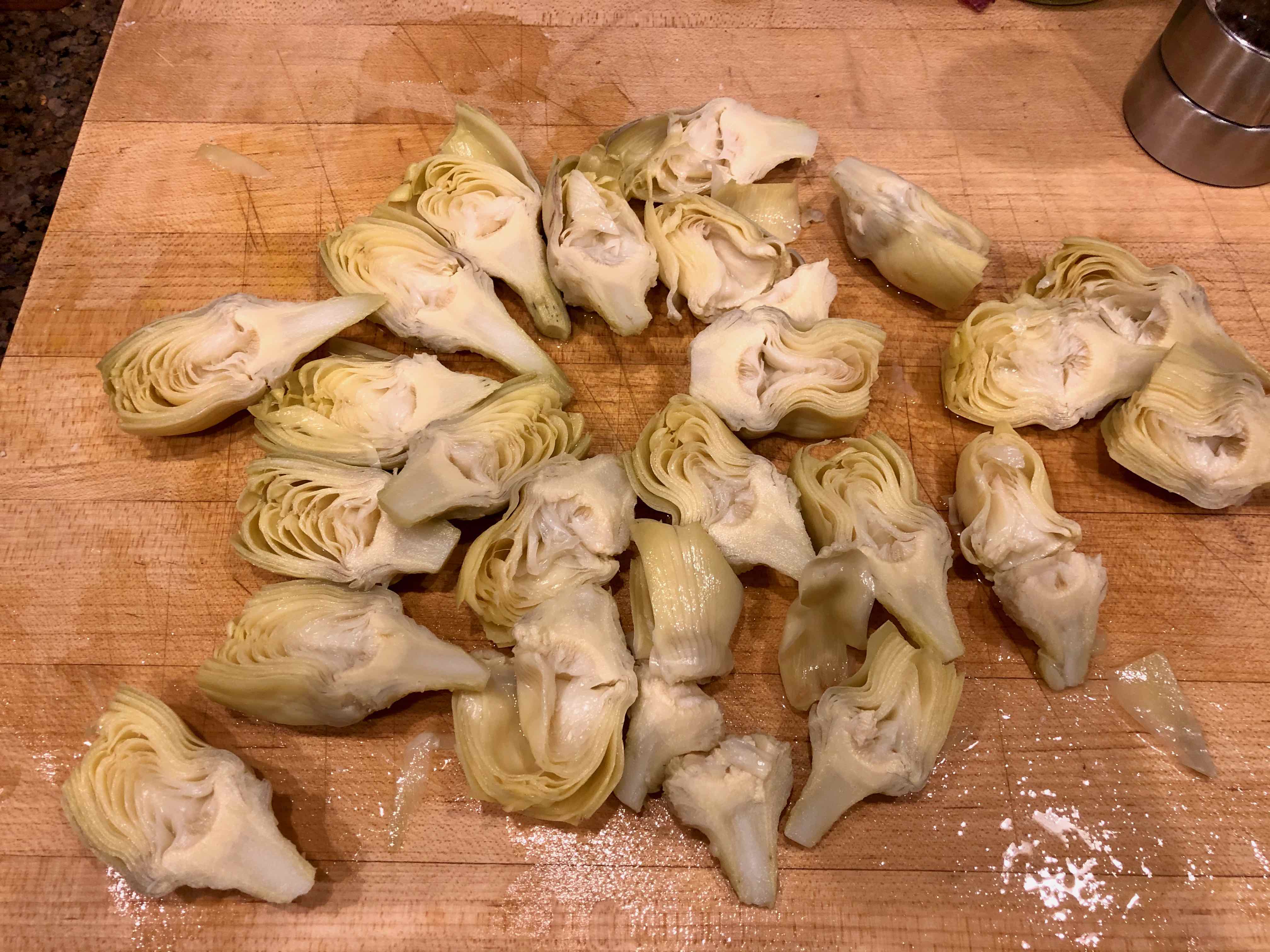Despite their criticism and fault finding with the recipe, I decided to prepare it but was able to avoid many of the setbacks other readers had with it mainly because I was able to find a video of her making the dish. From the YouTube video, I gleaned a few key items, of which the most important was what size of the canned artichoke heart. Indeed, until I went shopping for them I hadn’t realized there were so many can options: quartered, 8-10 pieces, 5-7 pieces. In the video, Roman used the Cento brand 5-7 pieces can, which made sense since the recipe calls for slicing the hearts in half and the larger pieces would stand up to the cooking. Unable to find Cento, I settled for our supermarket’s brand.