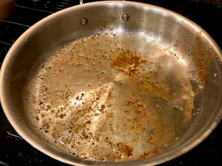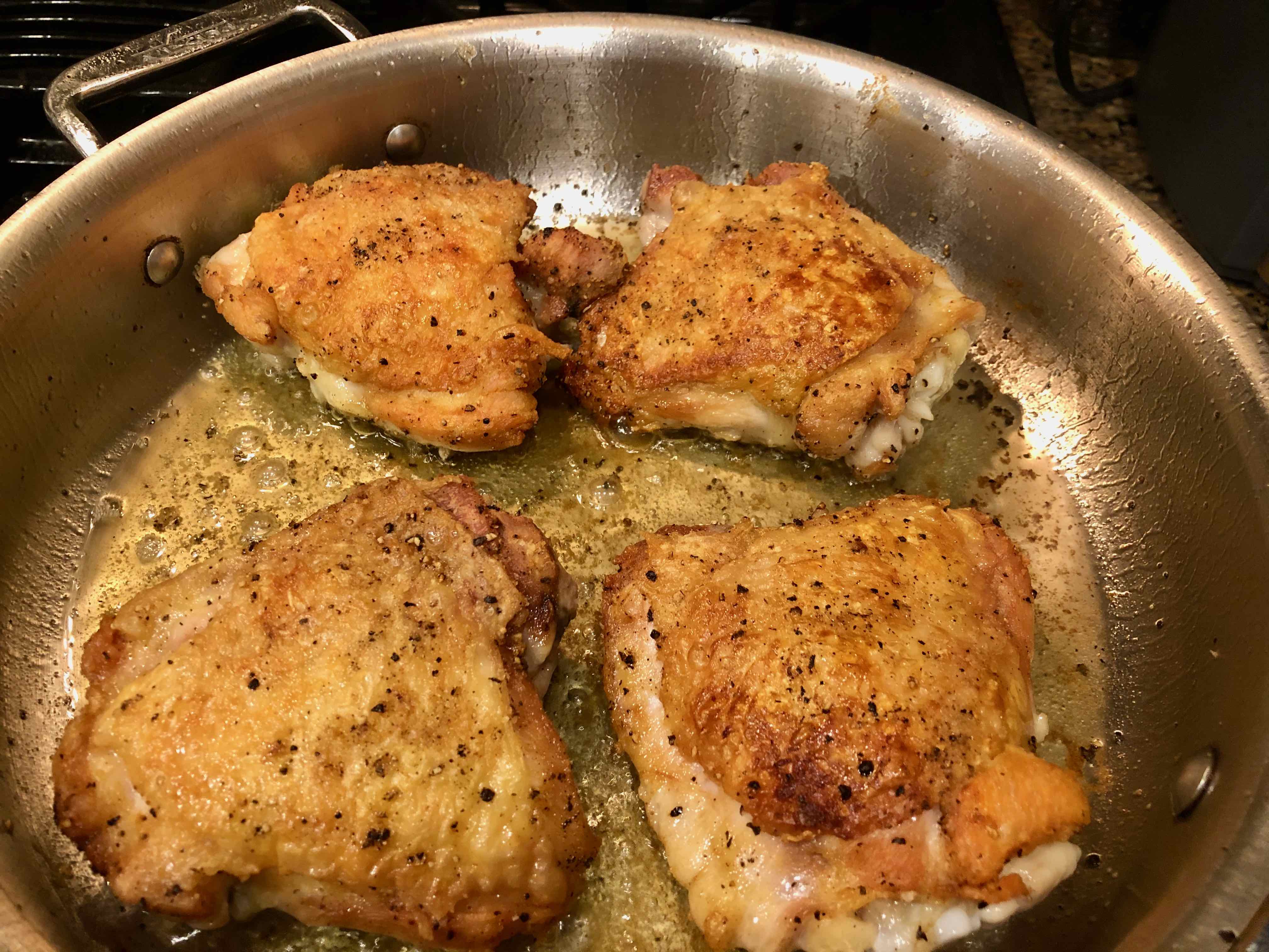 3. Using tongs, flip the chicken skin-side up. Lower the flame to medium and let the undersides cook for another 5 or so minutes. Set chicken aside. (Before proceeding to the next step, you may need to pour off some of the fat. Leave about 2 tablespoons of fat as well as all of the brown bits on the bottom of the pan.)