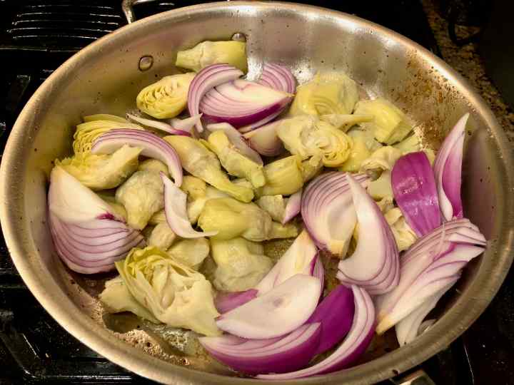 4. Add artichoke hearts and onions to the pan, season with salt and pepper, letting them sizzle until they get a little color, 3 to 5 minutes.