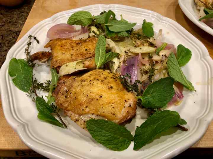 I highly recommend this recipe. It yielded an extraordinarily aromatic and tasty dish. The chicken was fall-off-the bone tender and juicy, with surprisingly crispy skin for a braised dish. (As Roman points out in the video, however, it’s a shallow braise.) The artichokes were far better than I had expected and, along with the red onion, added a subtle sweetness to the tangy chicken-flavored sauce. If you like a thicker sauce, you may want to reduce it some at the end after removing the chicken. But for me, it was fine as is.