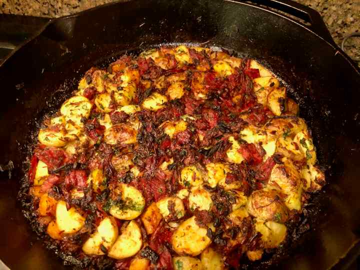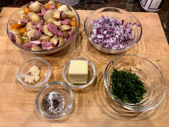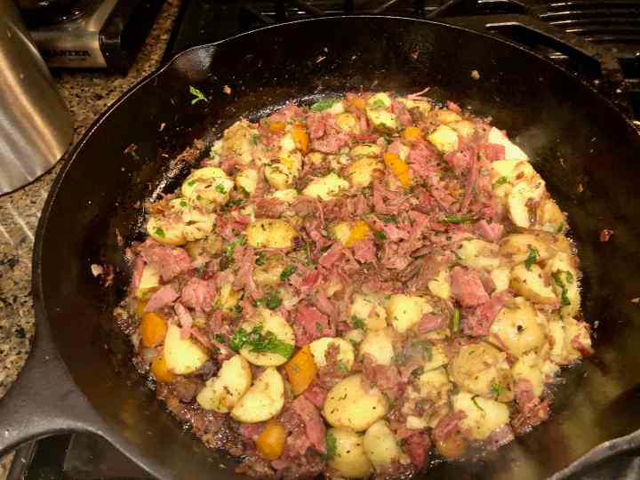 Given the times we’re living in, the leftovers were indeed a godsend. So, with the remains of our Paddy’s Day meal, I decided to make corned-beef hash, following a recipe I found on the web on The Spruce Eats website. More enthusiastic about this dish than I was about the corned beef, I decided we’d take photographs of the preparation and write a post about it.