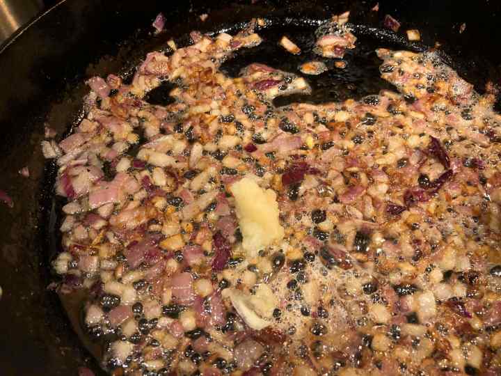 2. When the butter is hot, add the chopped onion. Sauté the onion, adding a pinch of salt, stirring, until it is translucent and softened.