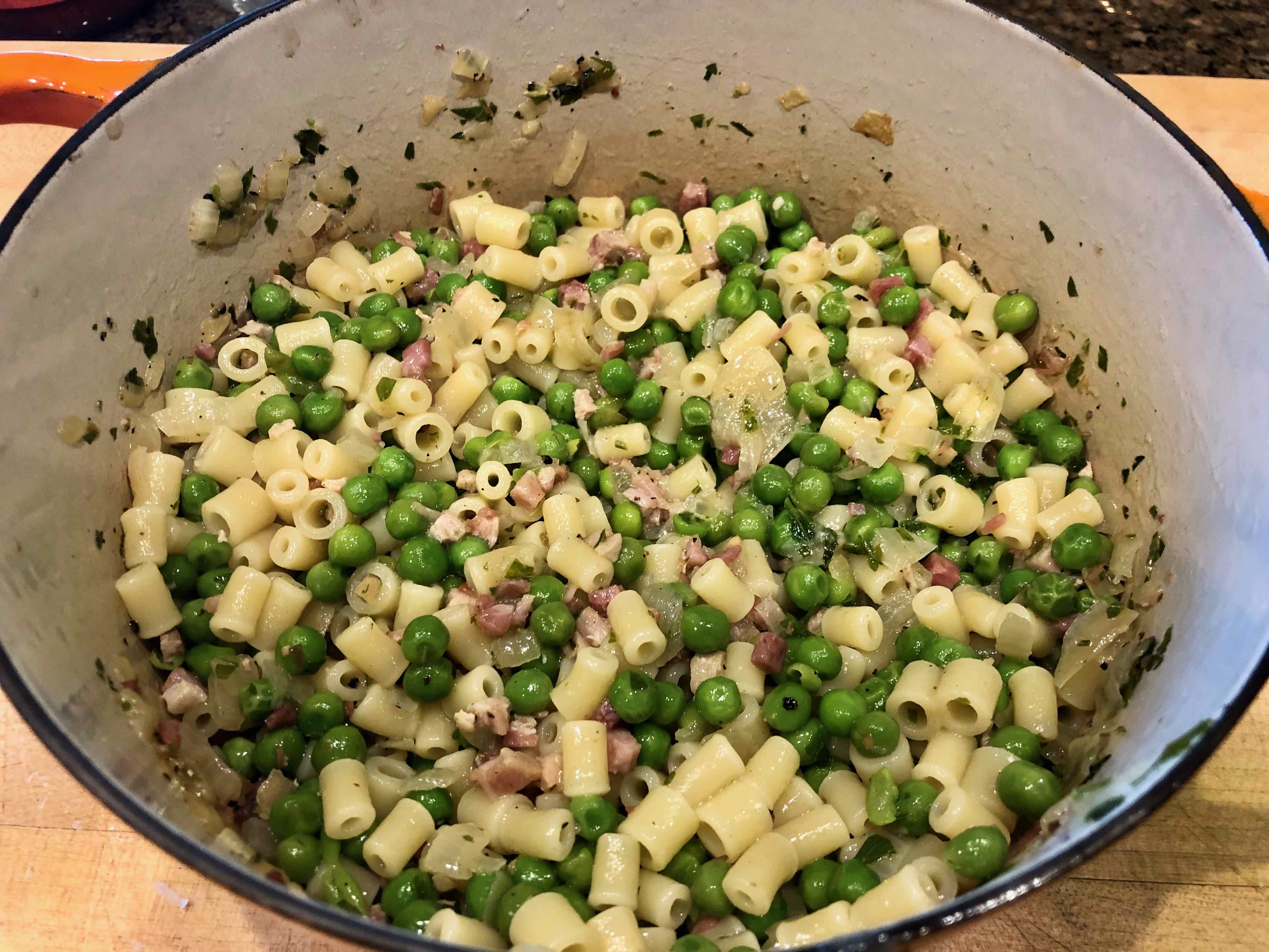 Such was the case this evening, when I found a few ounces of chopped pancetta that was a little beyond its “best-used-by” date, a third of an onion, an almost empty bag of frozen peas, and the remainder of a package of ditalini pasta.