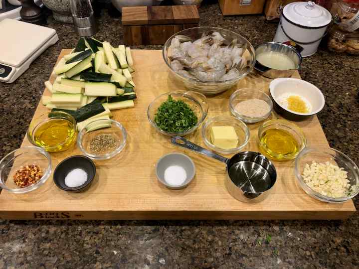 However, for some of the other ingredients, especially those for sautéing the zucchini and the shrimp (oil and seasonings) and for preparing the sauce (wine and butter) I used my eye. Indeed, I believe it’s important to keep in mind that halving a recipe doesn’t work like a mathematical formula. For example, the amount of oil for sautéing the zucchini is determined as much by the size of the pan as it is by the number of zucchini. So rather than reducing these ingredients by half, I use approximately two-thirds of the amount called for. The same applies to seasoning, which I determine by taste and personal preference; sometimes even increasing the original amount as I did with the red-pepper flakes.