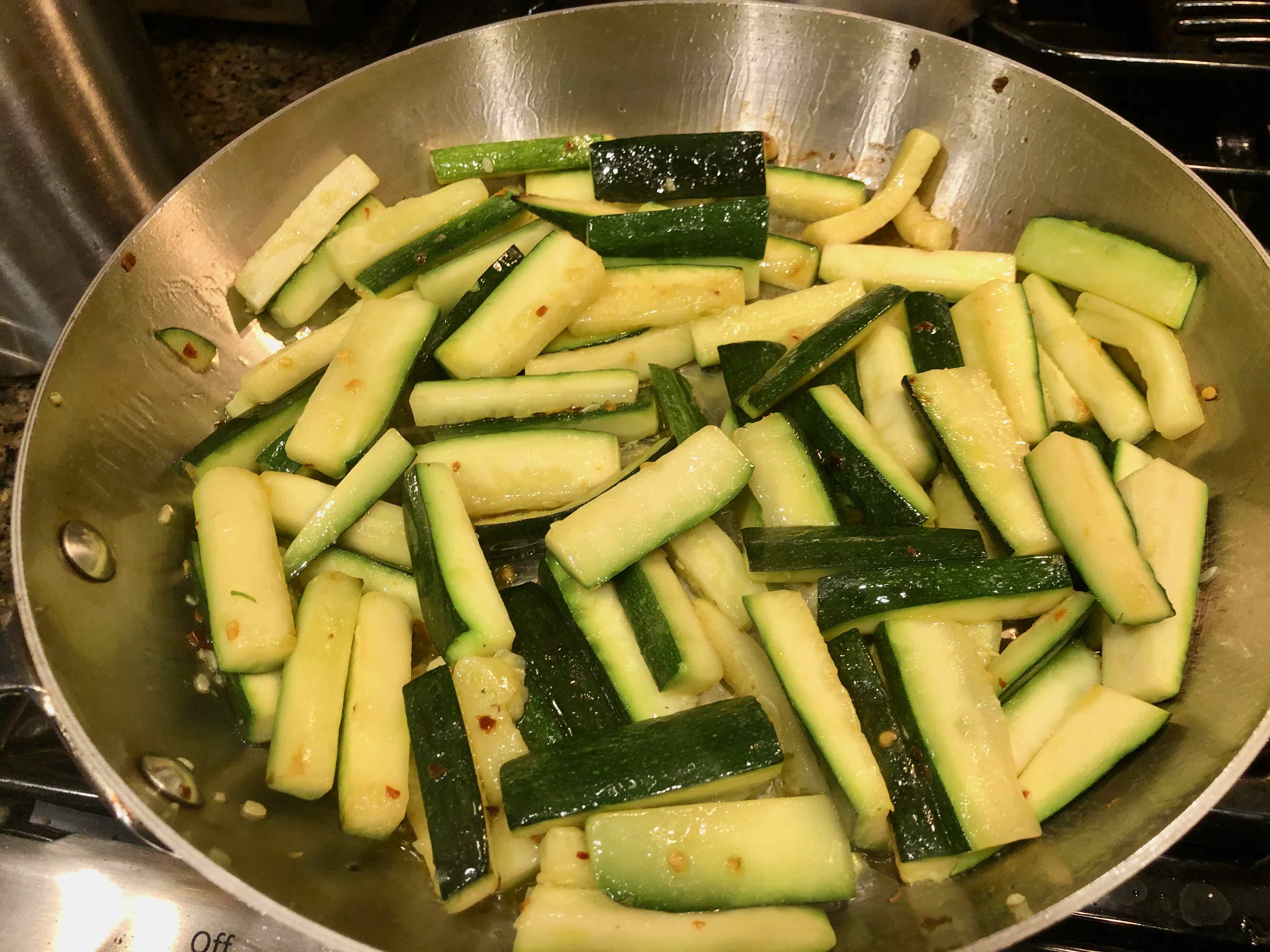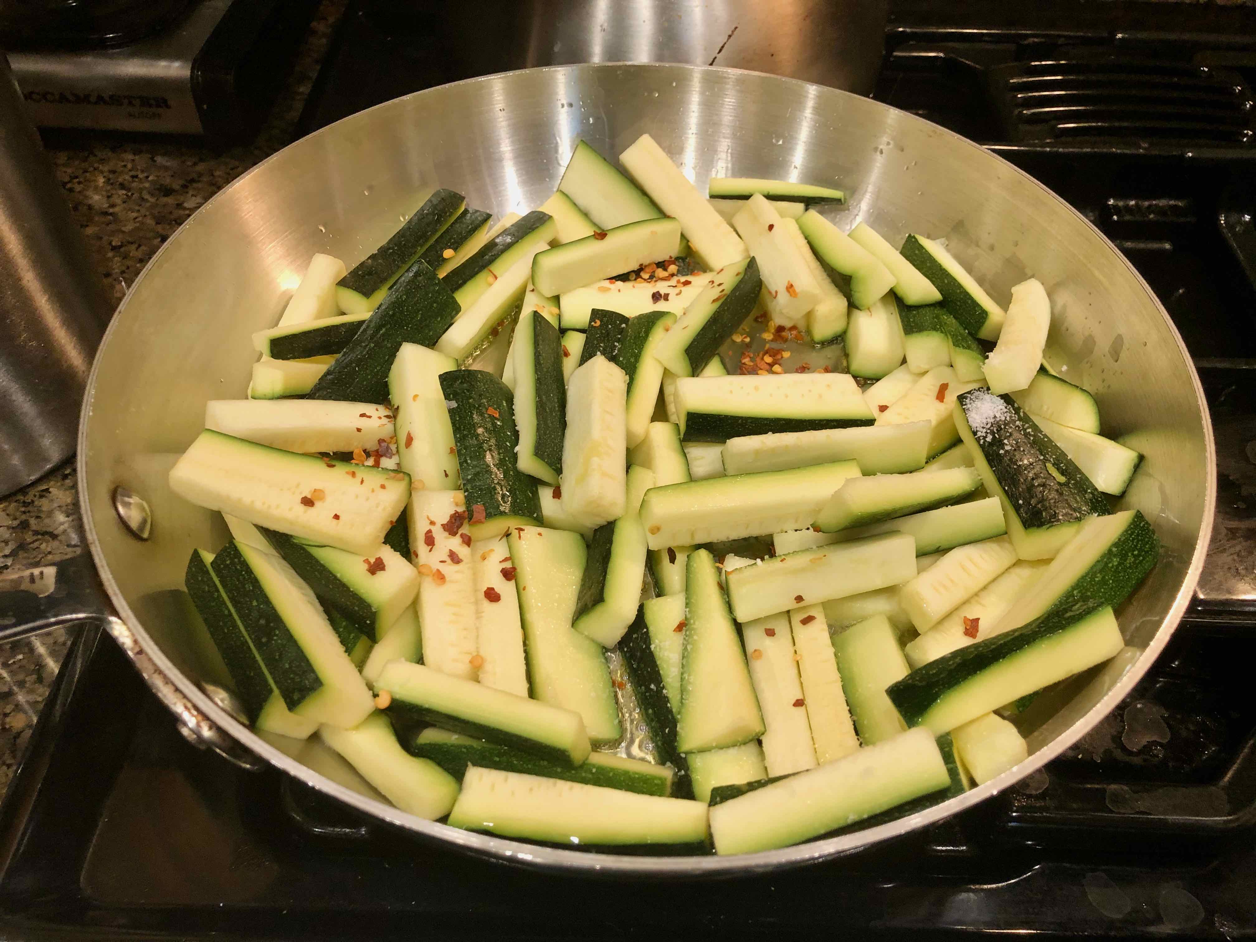 1. For the zucchini, add the olive oil to a large skillet over medium-high heat. When the oil is hot, scatter the zucchini. Season with salt and red pepper flakes.