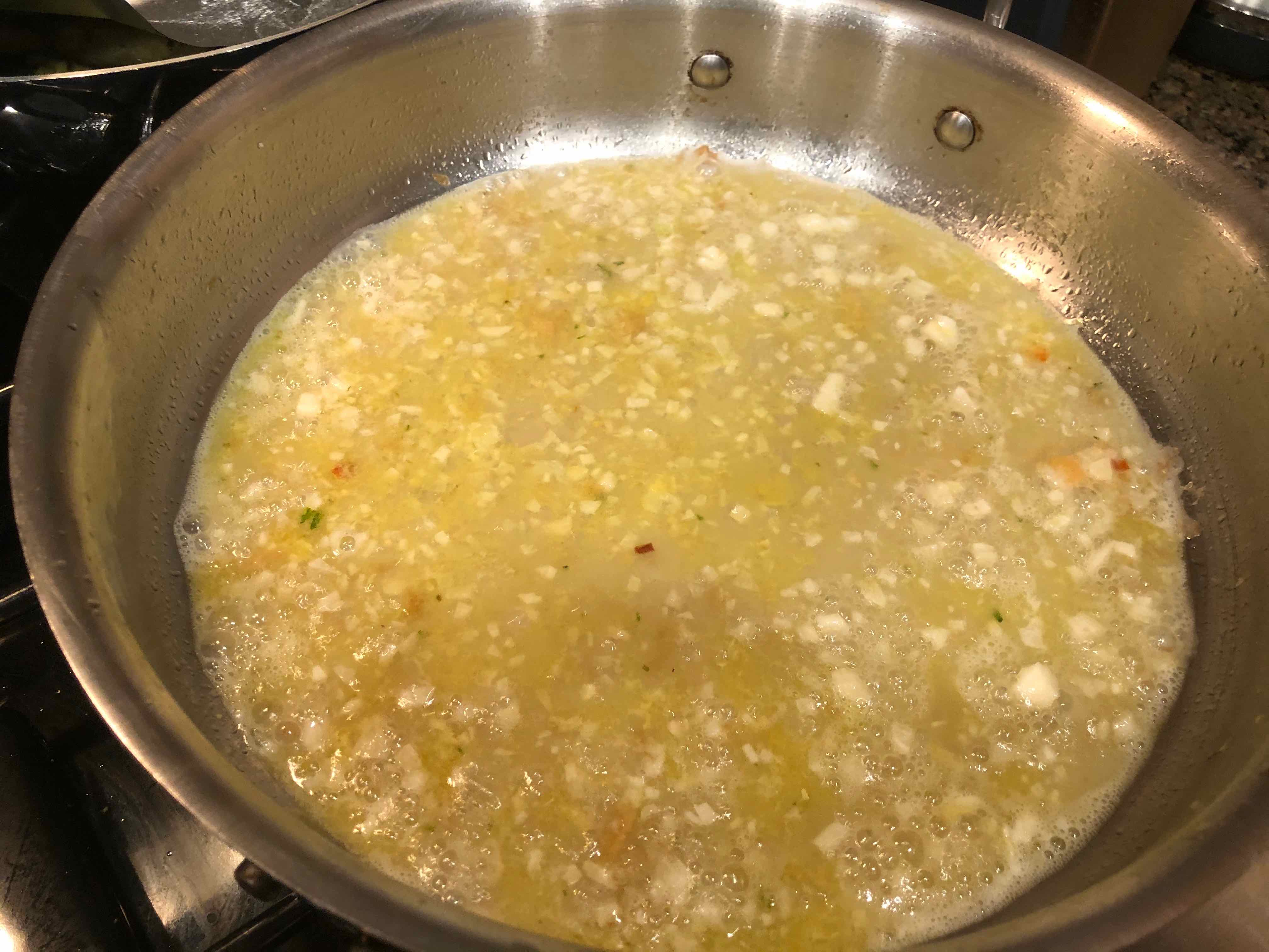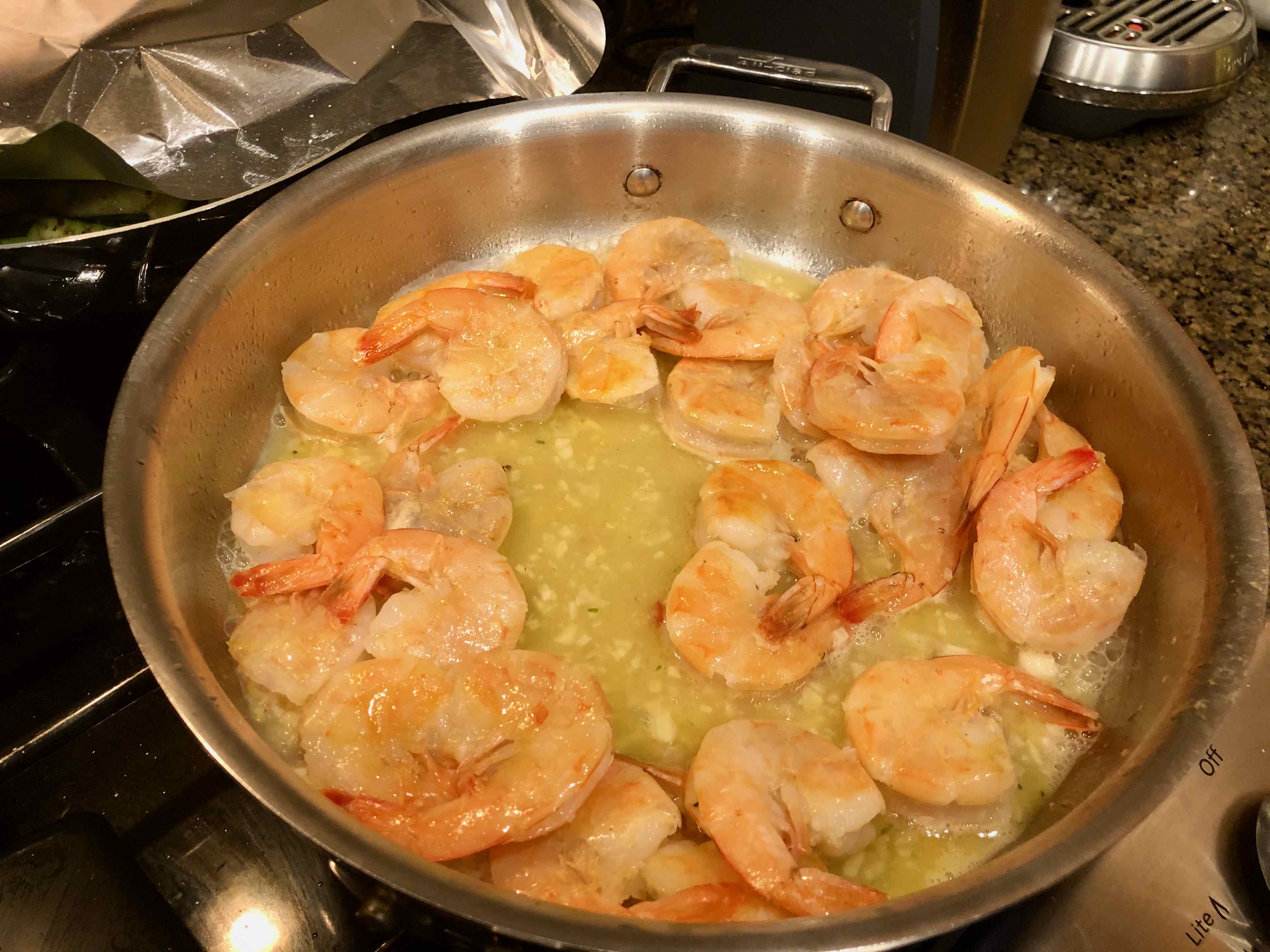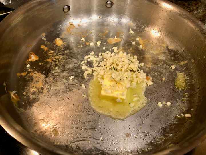 5. When all of the shrimp is out of the skillet, add the garlic and butter to the oil remaining in the pan, and cook until sizzling, about 2 minutes.