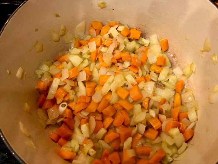 2. Add the onions, carrots, and fennel and cook over medium-low heat for 8 to 15 minutes, stirring occasionally, until the onions start to brown and get soft.