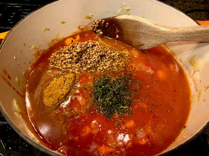 6. Bring to a boil, lower the heat, and simmer, covered, for 30 to 40 minutes, until the lentils are tender. Stir occasionally, scraping the bottom of the pot, with a wooden spoon and check to be sure the liquid is simmering.