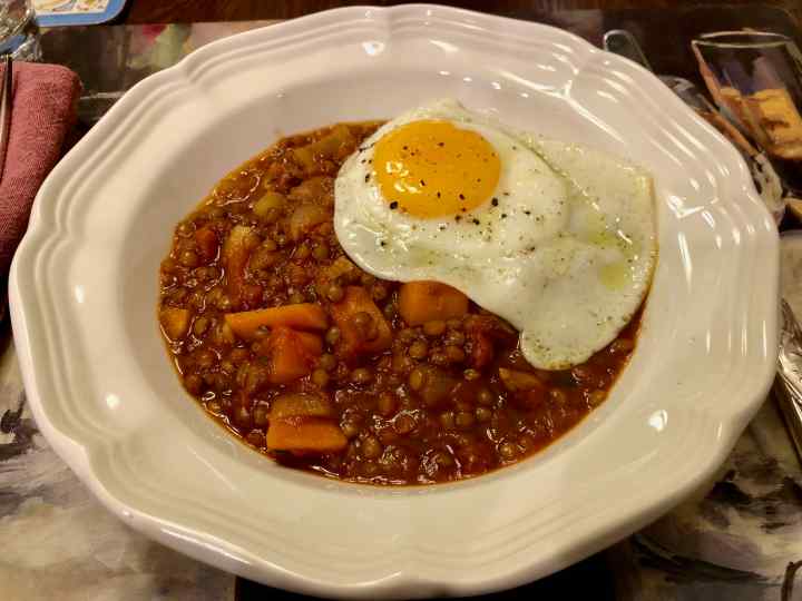 The recipe calls for readily available ingredients and a minimal amount of preparation. The most difficult part is waiting for the stew to cook as its tantalizing aromas fill the kitchen. But when it’s done, you have a dish with earthy aromatics as well as savory and sweet flavors. The lentils still have some bite and are complemented by the unctuous texture of the chunky carrots, onions, and fennel. There’s an underpinning of spice from the curry powder, an herbaceous note from the thyme, and a brightness from the touch of red-wine vinegar added before serving.