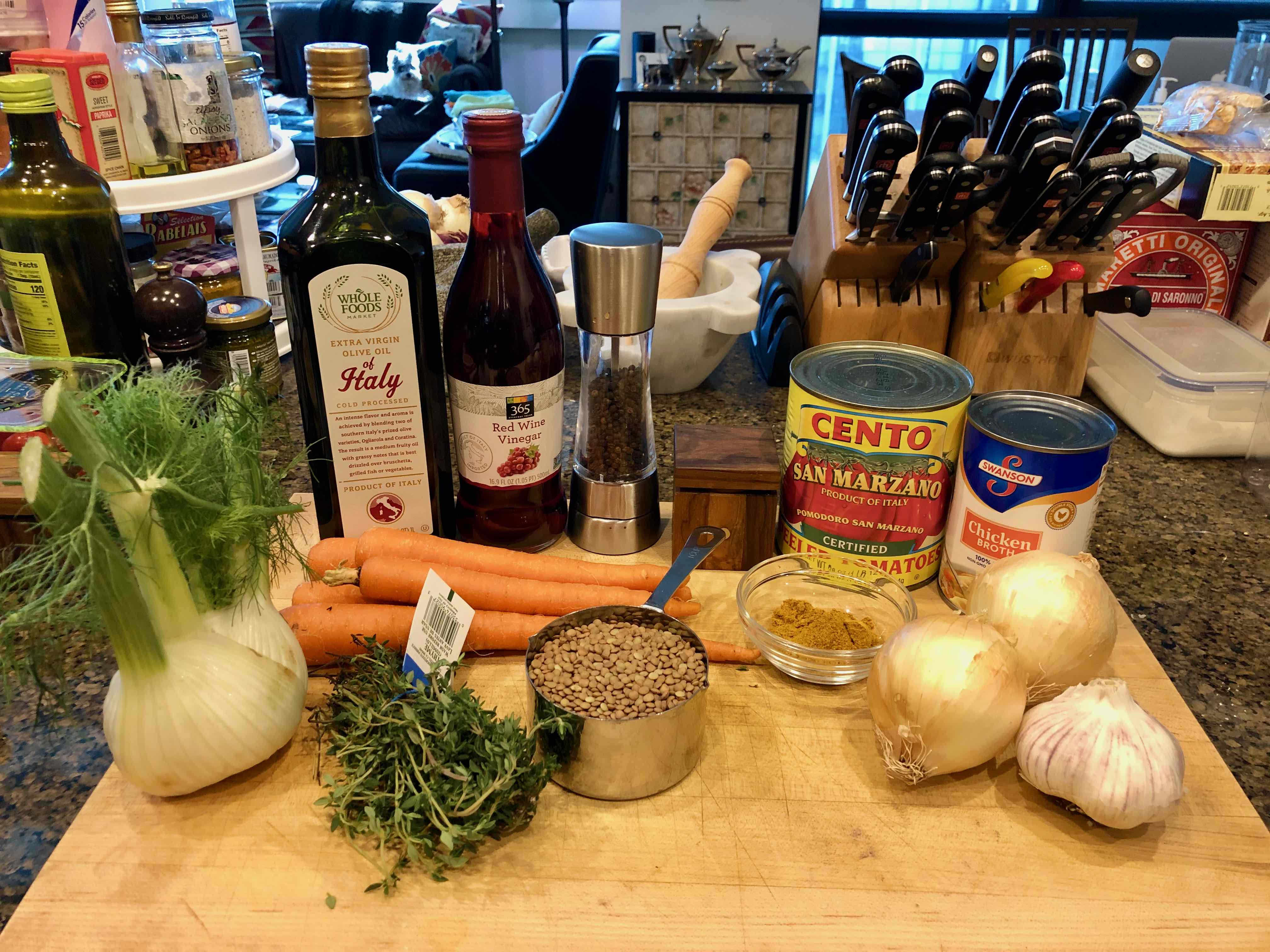 But I digress. Garten’s recipe, “Stewed Lentils and Tomatoes,” comes from her 2006 book Barefoot Contessa at Home and can also be found online both on her own website as well as on the Food Network’s site. The versions are slightly different. The former does not include fennel; the latter, however, erroneously calls for 2 teaspoons of oil as opposed to the 2 tablespoons listed in the former. For this post, I’ve combined both versions.