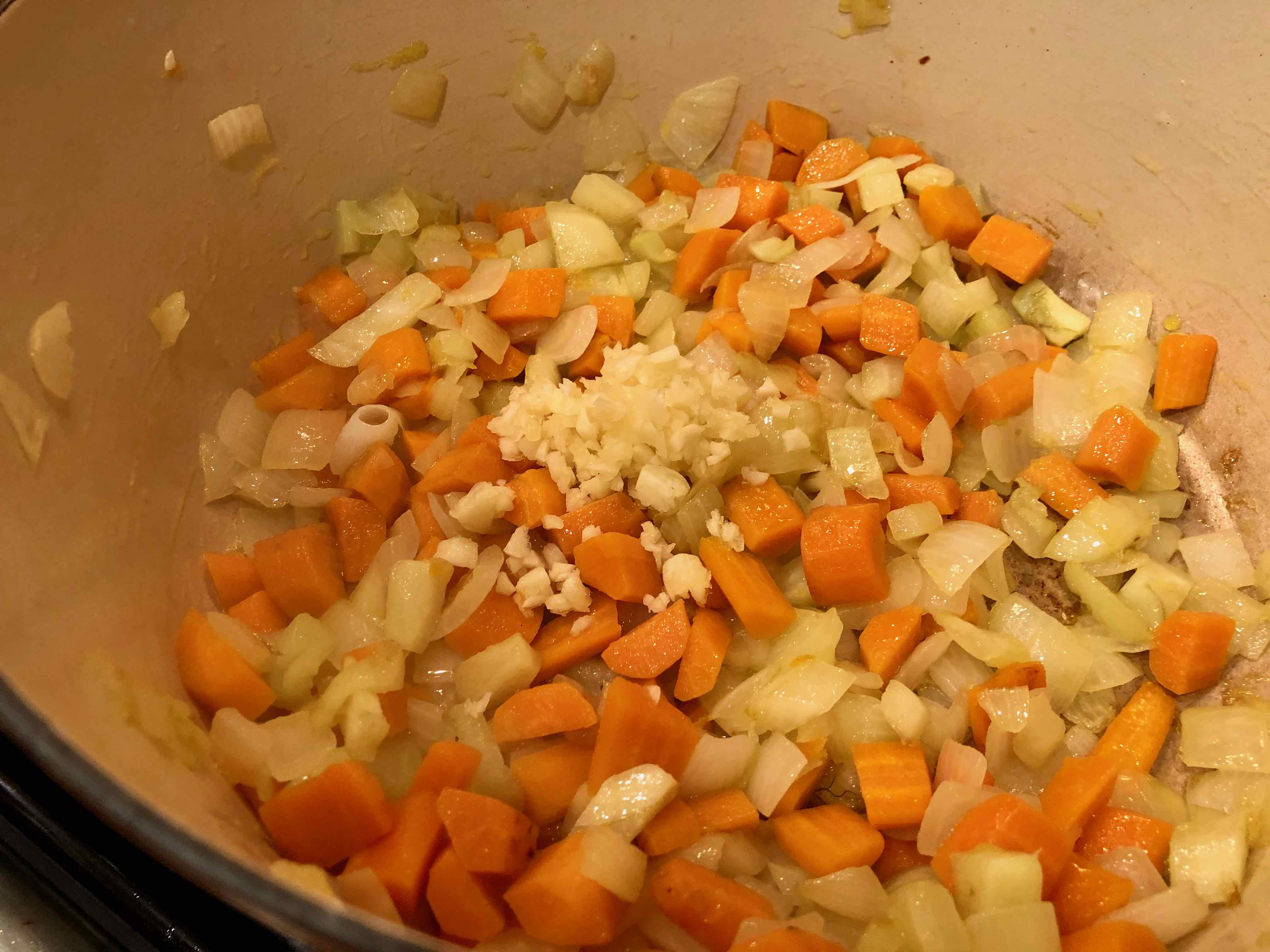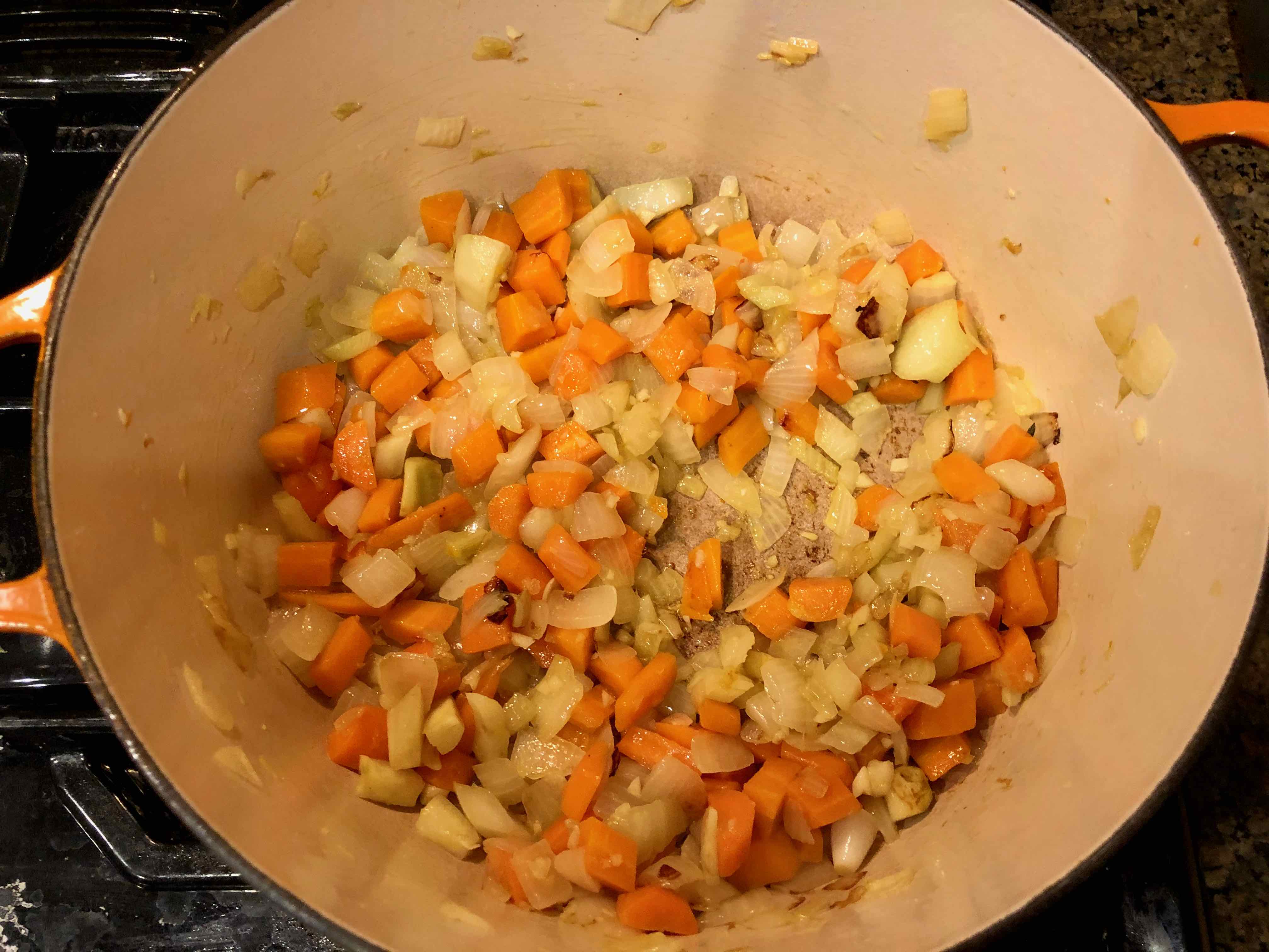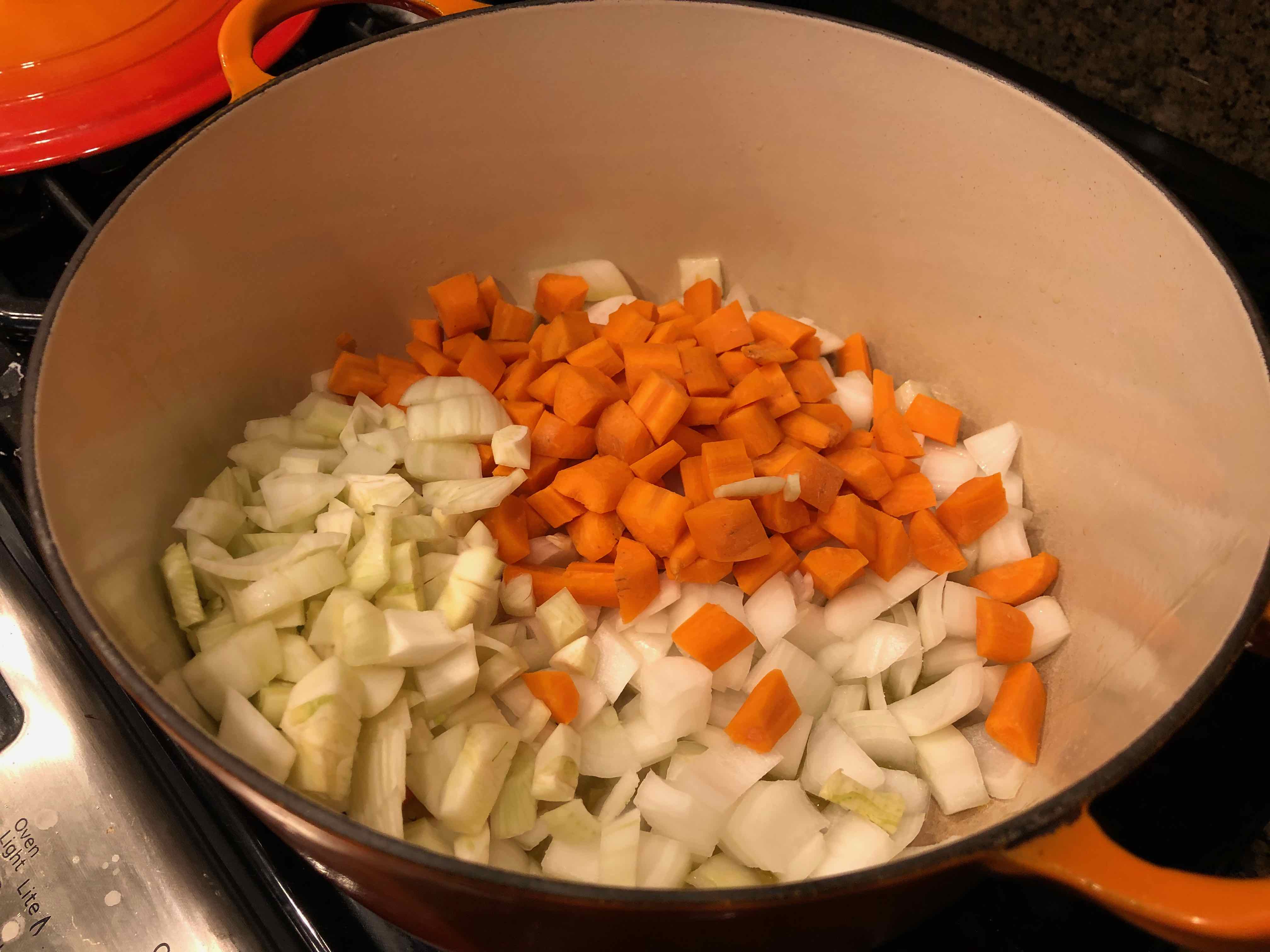 2. Add the onions, carrots, and fennel and cook over medium-low heat for 8 to 15 minutes, stirring occasionally, until the onions start to brown and get soft.