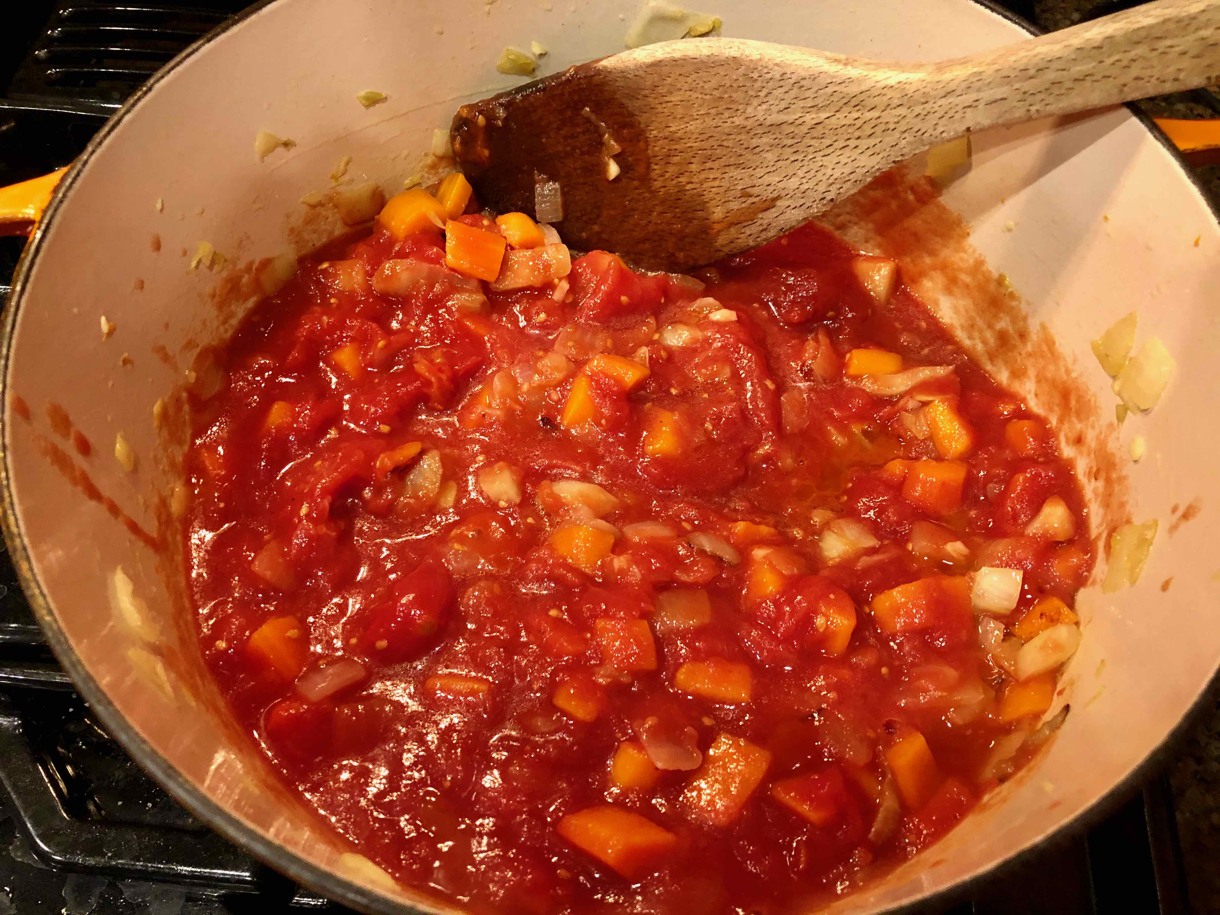 4. Meanwhile, place the tomatoes, including the juice, in the bowl of a food processor fitted with a steel blade and pulse several times until the tomatoes are roughly chopped. Alternatively, you can simply crush the tomatoes by hand or substitute a can of crushed tomatoes.